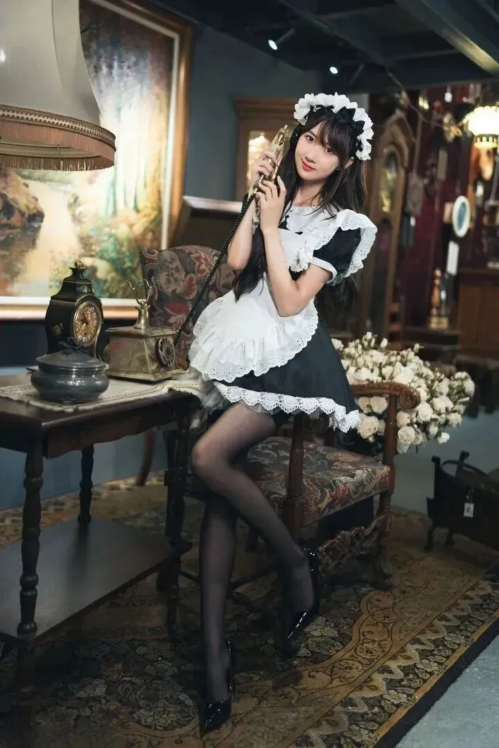 她坐在一把复古的沙发上用手提电话机打电话。这身衣服细节做得很好。围裙外面有蓬松的蕾丝边,领口、袖口。料子柔软,使女仆装有淡淡的甜味。