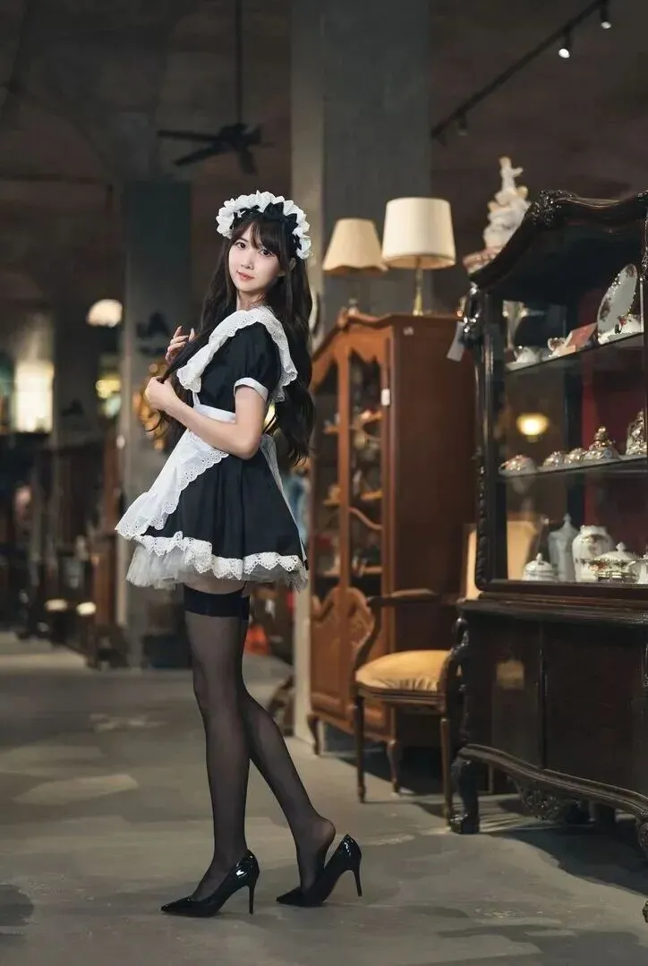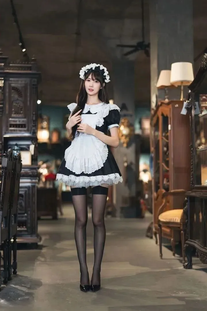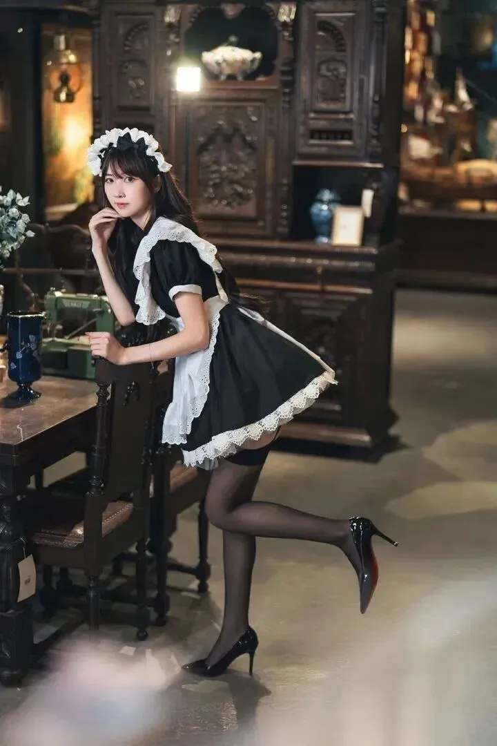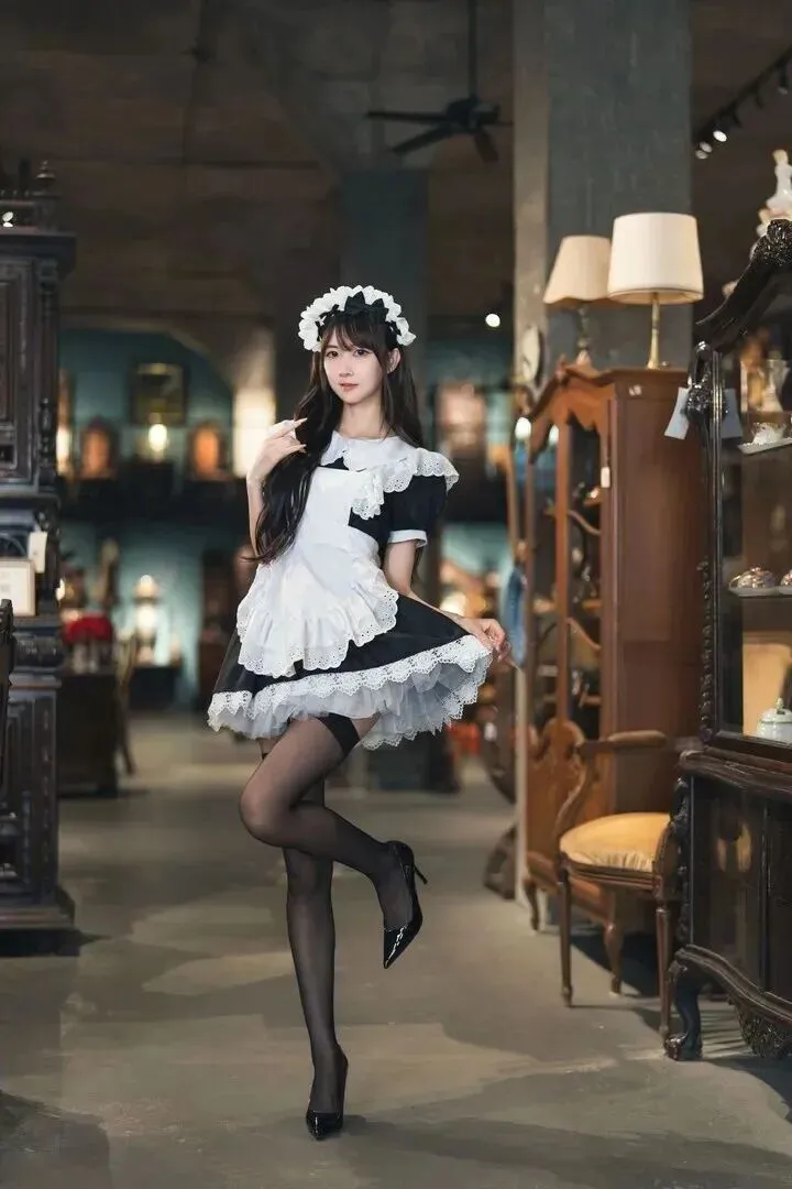 她双腿并拢,脚尖前出,脚跟后出。这套衣服的核心就是在于细节。围裙上有很多带蕾丝折边的印花镂空图案。现在很少有这么用心的工艺了。