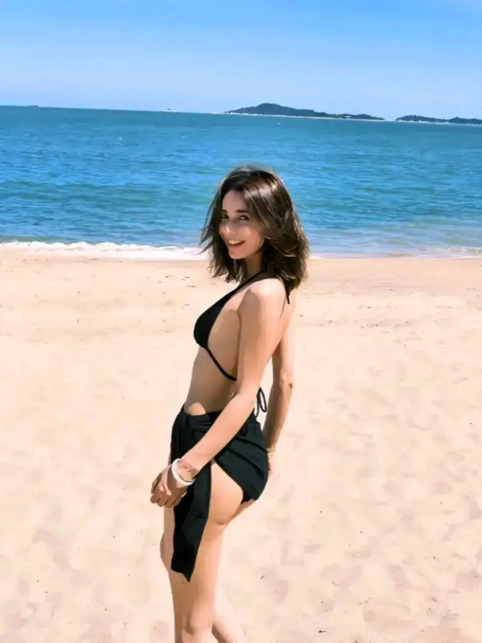 在那片无垠的海边,阳光洒落在金色的沙滩上,海浪轻轻拍打着海岸线。就在这如诗如画的美景中,一位身着性感泳衣的漂亮女子正在快乐地玩耍,她的身影吸引了众多目光。