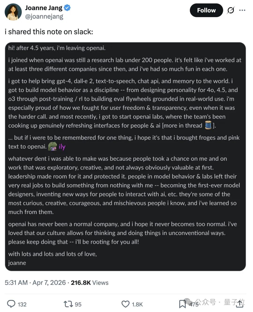 「4o之母」Joanne Jang发了一篇长文,宣布结束自己在OpenAI四年半的旅程。