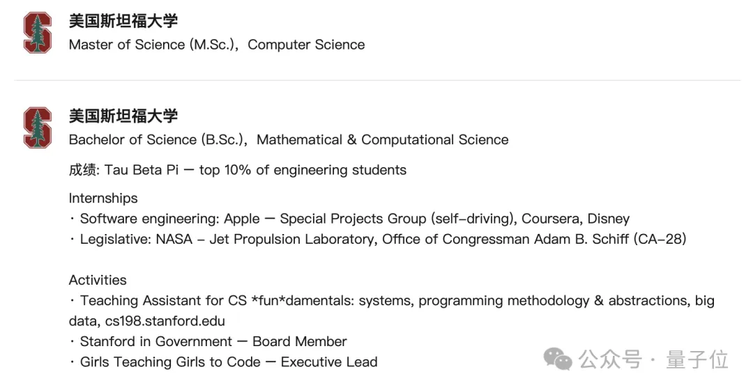 学业上,她是个标准的斯坦福学霸,本科专业应用数学,以top 10%的成绩毕业。