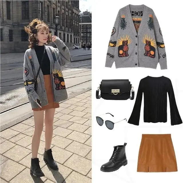 那件针织开衫 我也特别喜欢 衣上的彩绘斑斓 与整体色调相碰撞 让整件开衫都生动鲜活起来 袖子上的字母和彩色图案 设计感十足 我内搭了一件黑色T恤 下装穿了条皮裙 哇 那青春洋溢的感觉 简直活力满满