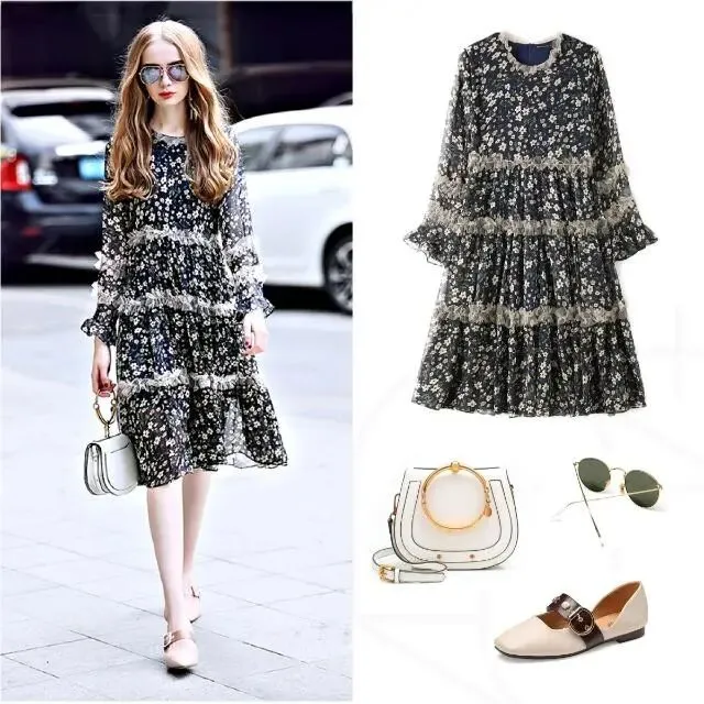 近几年 碎花连衣裙特别火 我也跟风买了一件 那垂坠网纱的材质 穿在身上质感十足 时髦环保的花朵印花设计 加上裙身层叠的木耳边和喇叭袖元素 清新又减龄 冬天的时候 我可以内搭 春天的时候 我可以单穿 每次穿它出门 都能穿出我的优雅大方