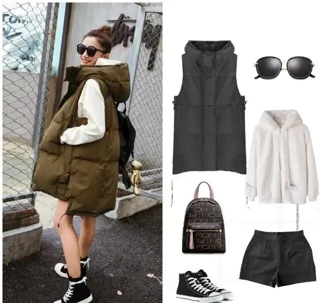 那件中长款羽绒马甲 我也特别喜欢 连帽设计 穿在身上轻松减龄 马甲的搭配也特别多样 毛衣 卫衣都可以作为内搭 天气暖和的时候 我还可以搭配一条碎花雪纺裙 想想那画面 就美得不行