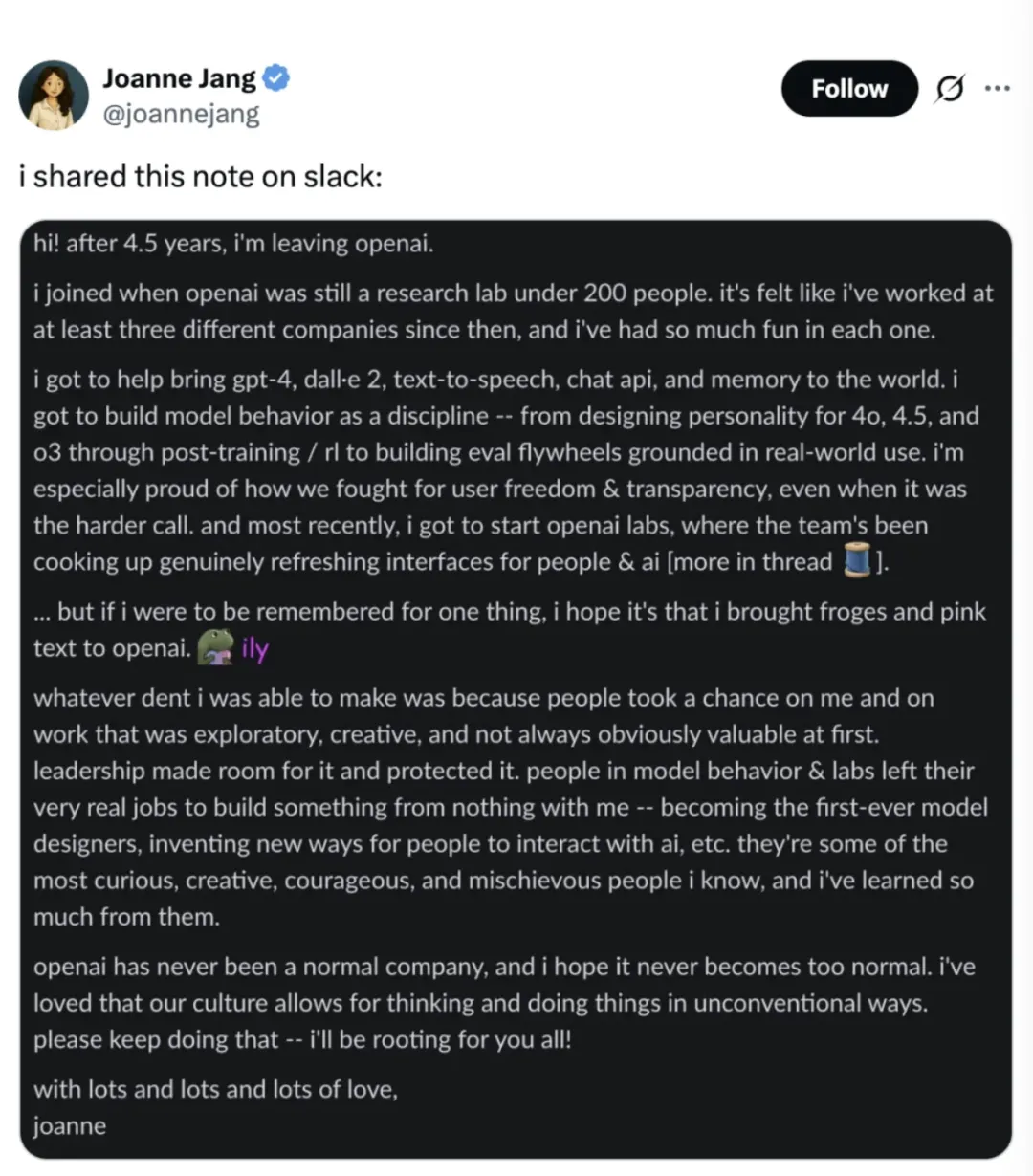 Joanne Jang 发长文,结束四年半 OpenAI 旅程。
