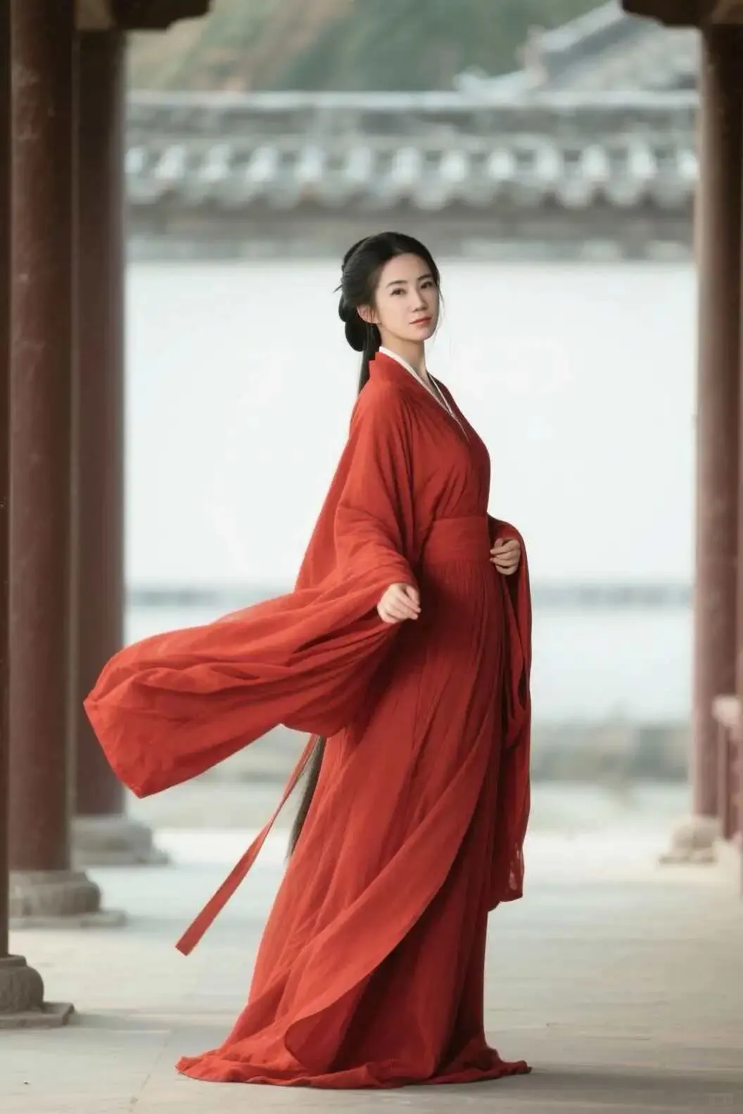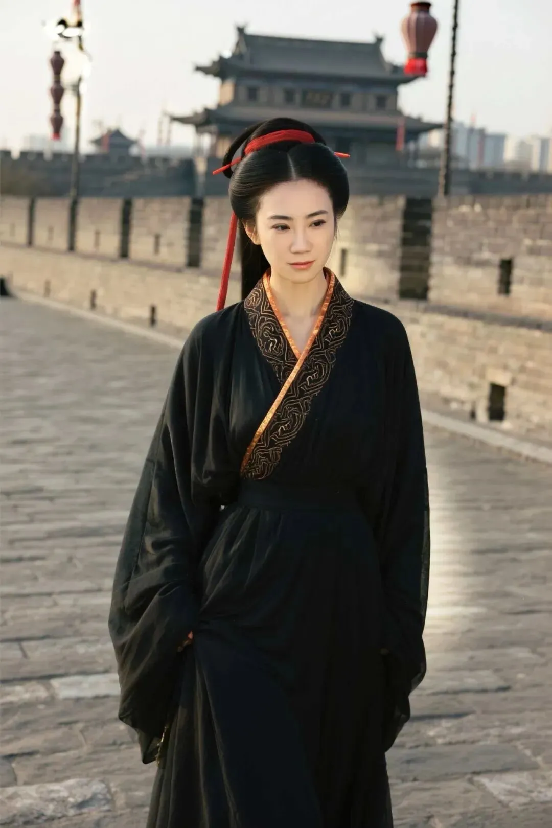 不同于玄黑的冷峻,朱红战国袍自带侠气与温婉,斜裁下裳步履间流转生姿,衣袂轻扬自带故事感。