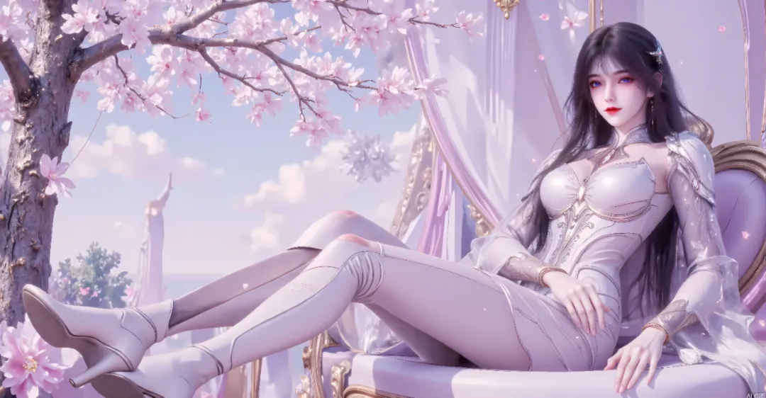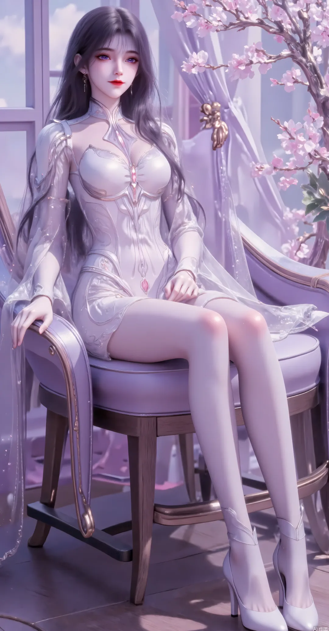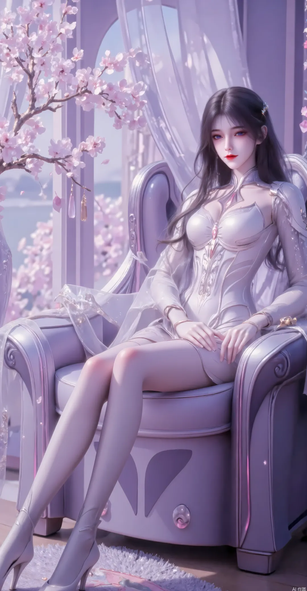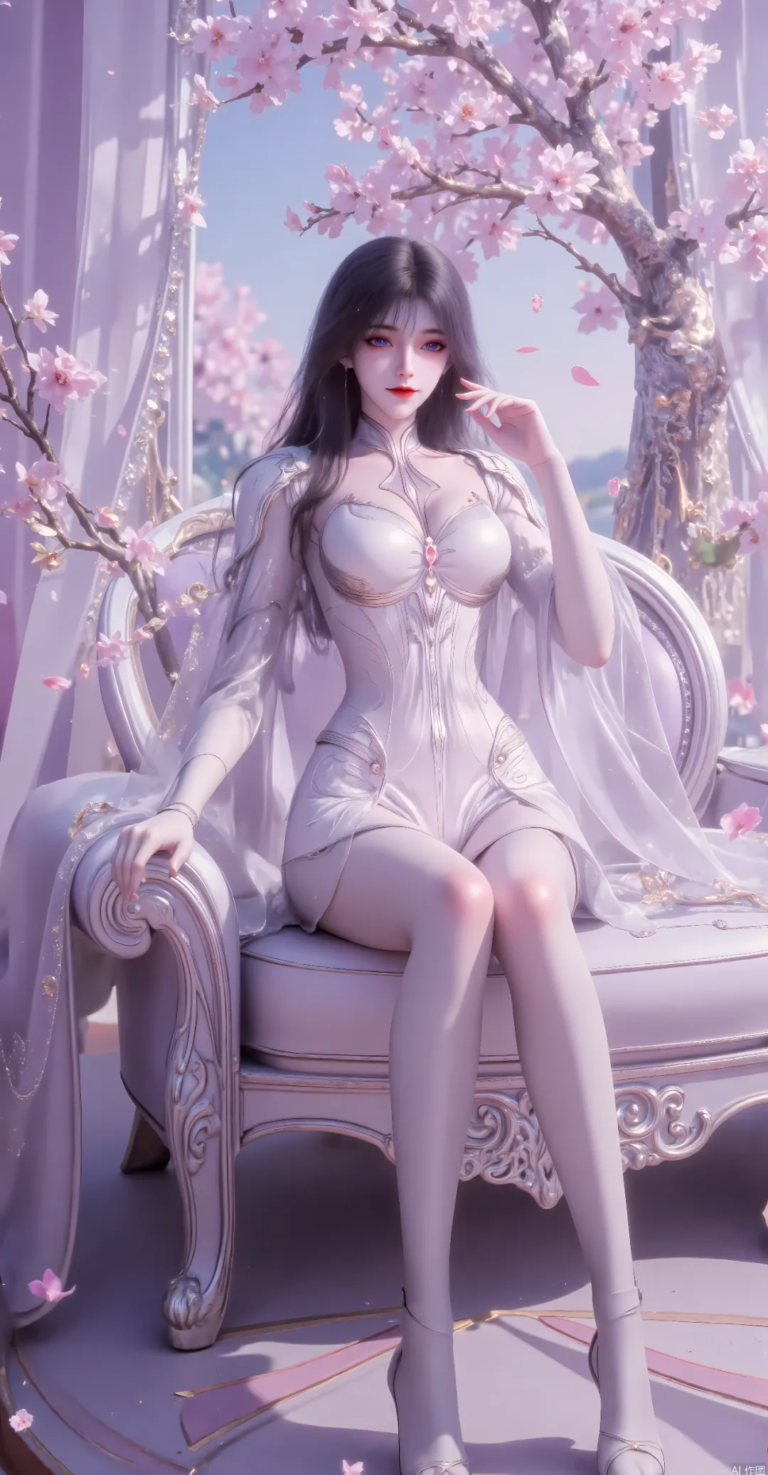 她优雅地坐在一把造型华丽的座椅上,双手自然地搭在椅臂两侧,双腿并拢前伸,姿态端庄又不失柔美,尽显身材曲线的同时,传递出一种“掌控感”或“高贵感”。