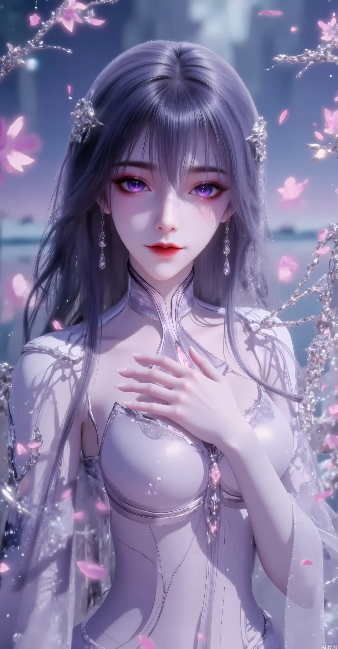 她黑发柔顺地垂落肩头,发间点缀着精致的银色发饰。她眼眸呈淡紫色,眼妆精致,红唇娇艳,神情平静而略带疏离感,仿佛自带“清冷女神”的气场。