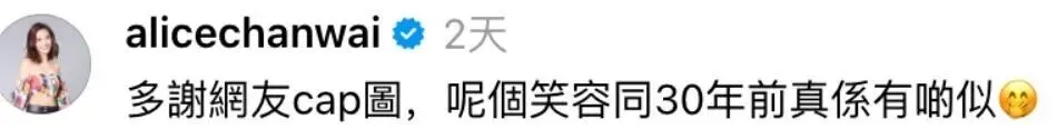 没过多久,陈炜本人也在社交媒体上转发了这组对比图,并配文:「谢谢网友截图,这个笑容和30年前真的有点相似。」同为实力派女星的宣萱也现身留言:「 I like the 2026 Alice 」并配上爱心眼表情,互动氛围颇为暖心。