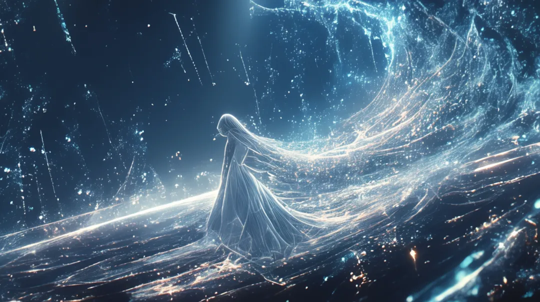 由发光粒子线条构成的长发女神,半透明剪影,身穿飘逸长裙,背对镜头站在星空之上,长发与裙摆化作流动的蓝色粒子光浪