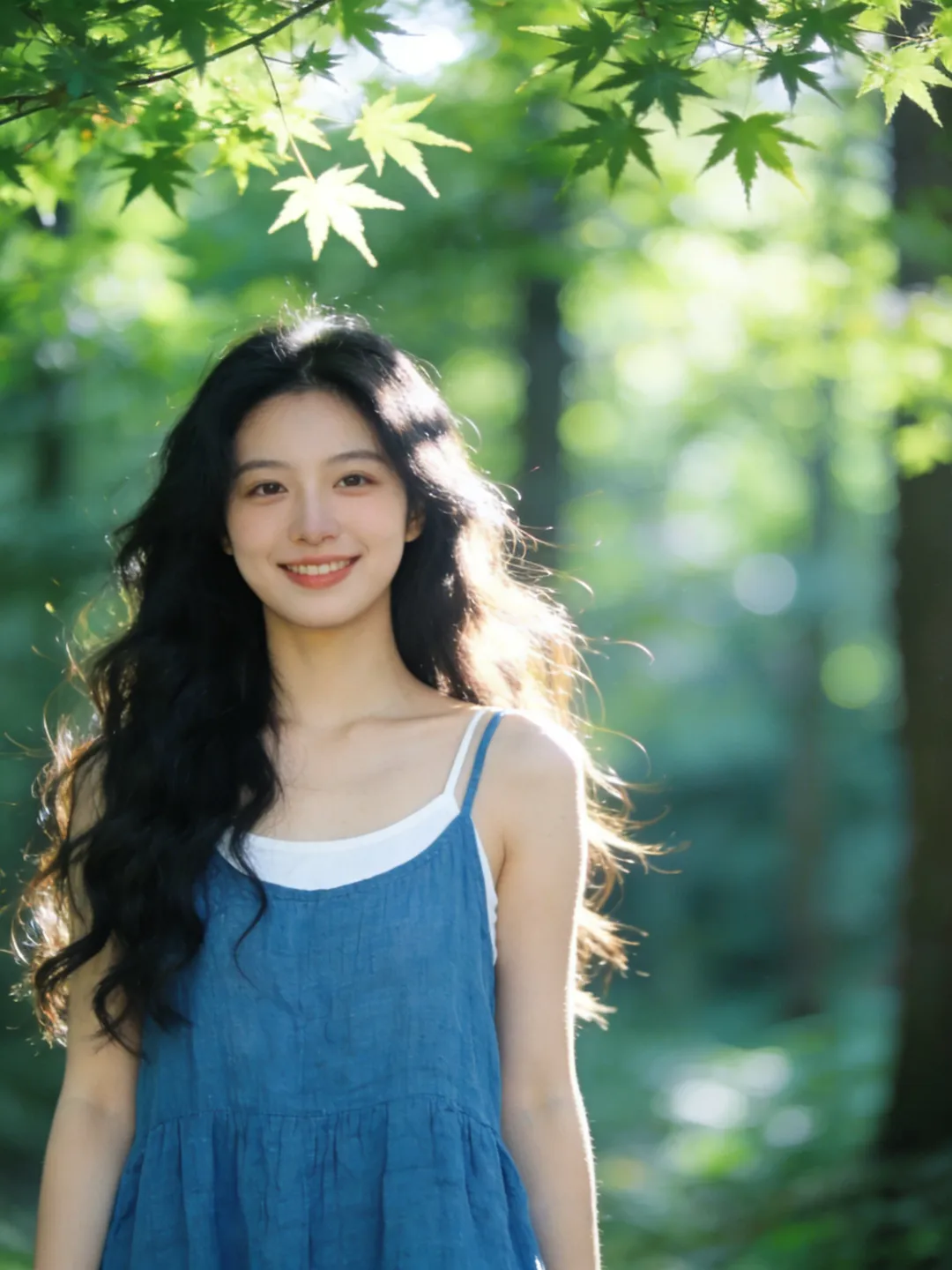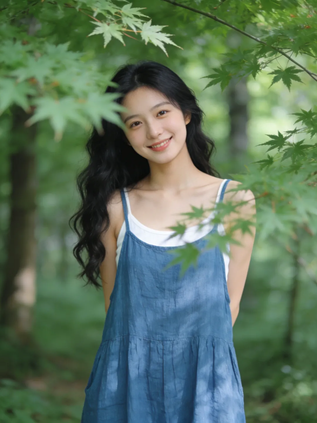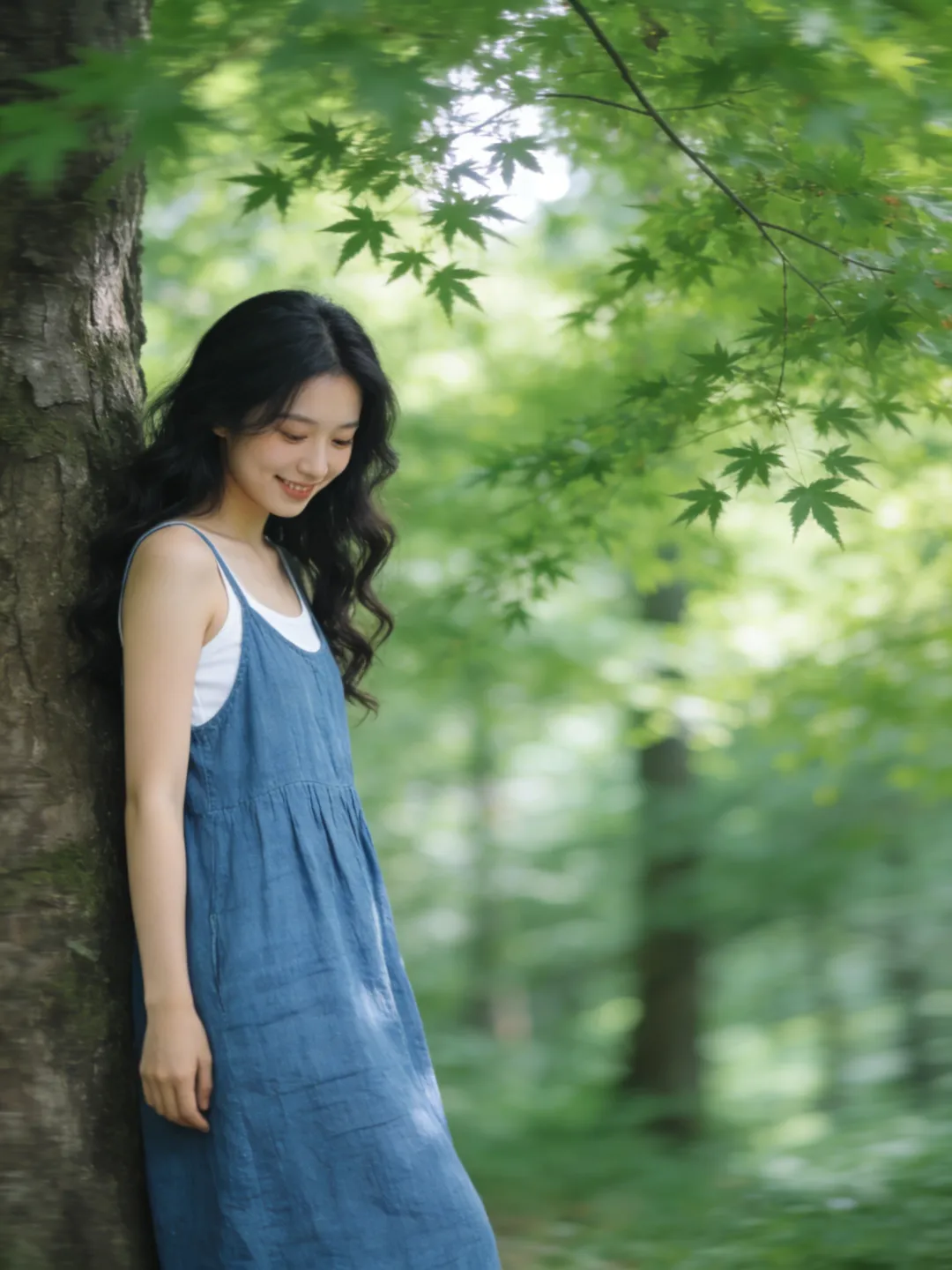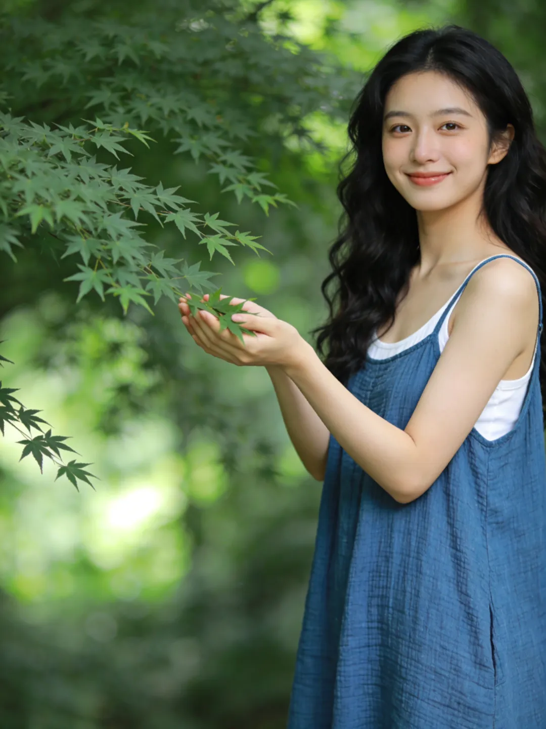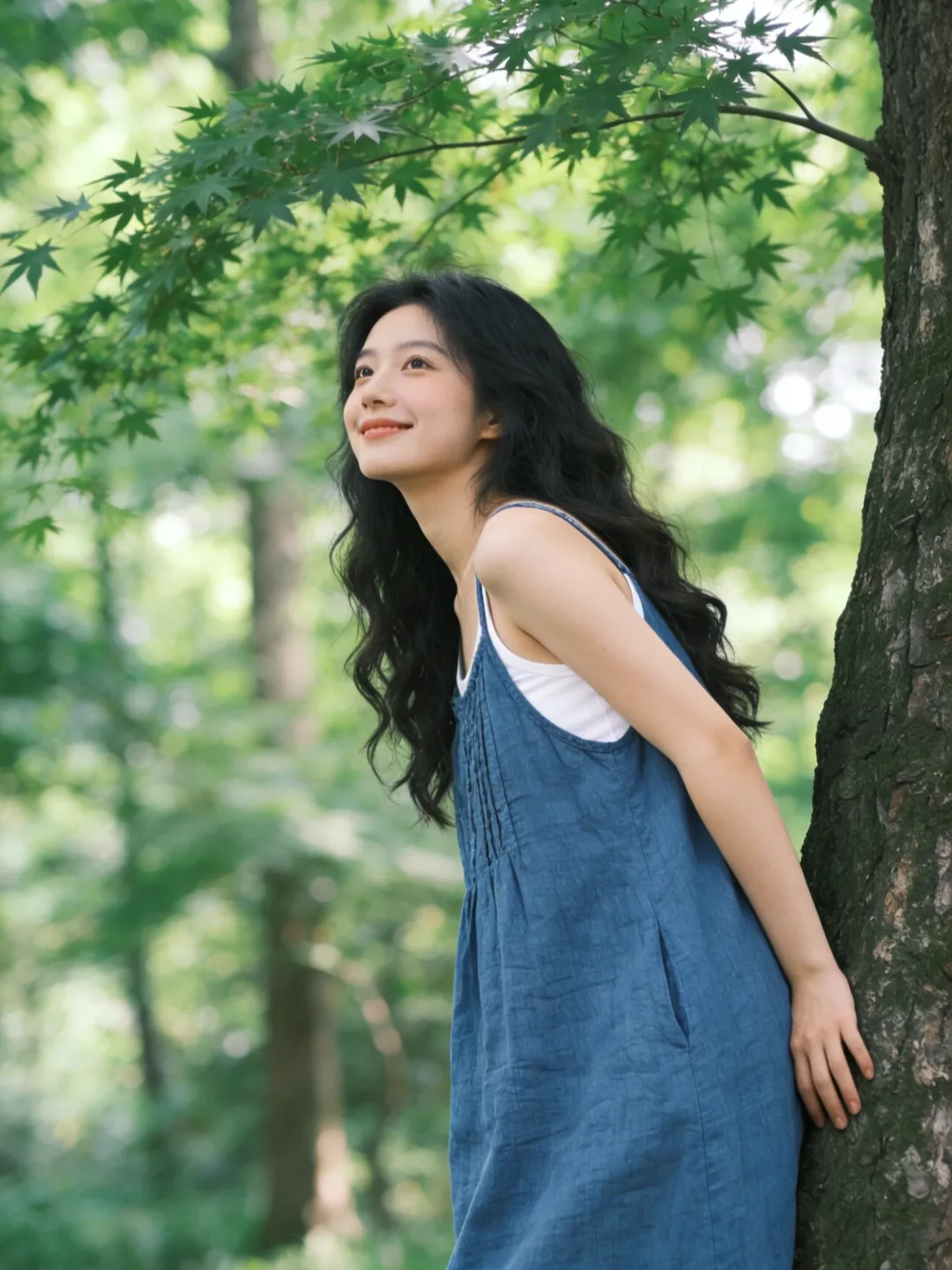 提示词:帮我生成8张图片:东亚 20 岁清纯甜妹,鹅蛋脸杏眼微笑,黑长波浪卷发,清透伪素颜,莫迪蓝棉麻吊带裙内搭白吊带,森林绿色枫树场景,背景树林虚化,日系清新森系人像,8K 高清,大光圈虚化,青绿色调滤镜,通透光影,电影感构图。人物全身入境,人物在画面的占比20%。更多不同的姿势和构图全身扶树看远方 回头笑抓拍 前景虚化半身 逆光发丝特写 走在林间小路 侧身靠树低头 捧树叶近景 仰拍天空 + 人物,比例 「3:4」