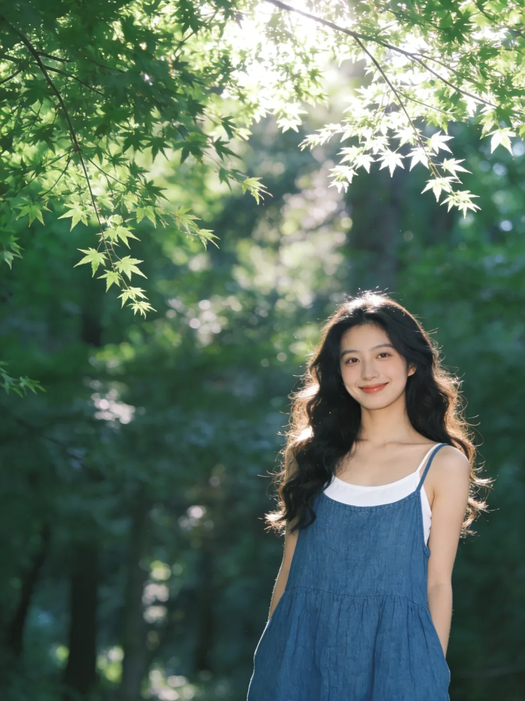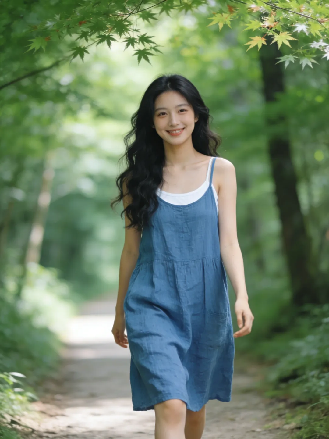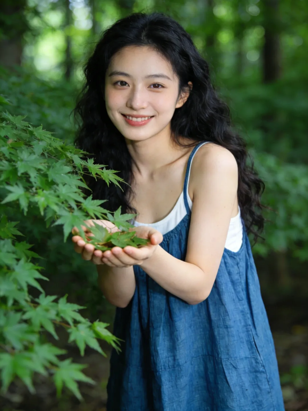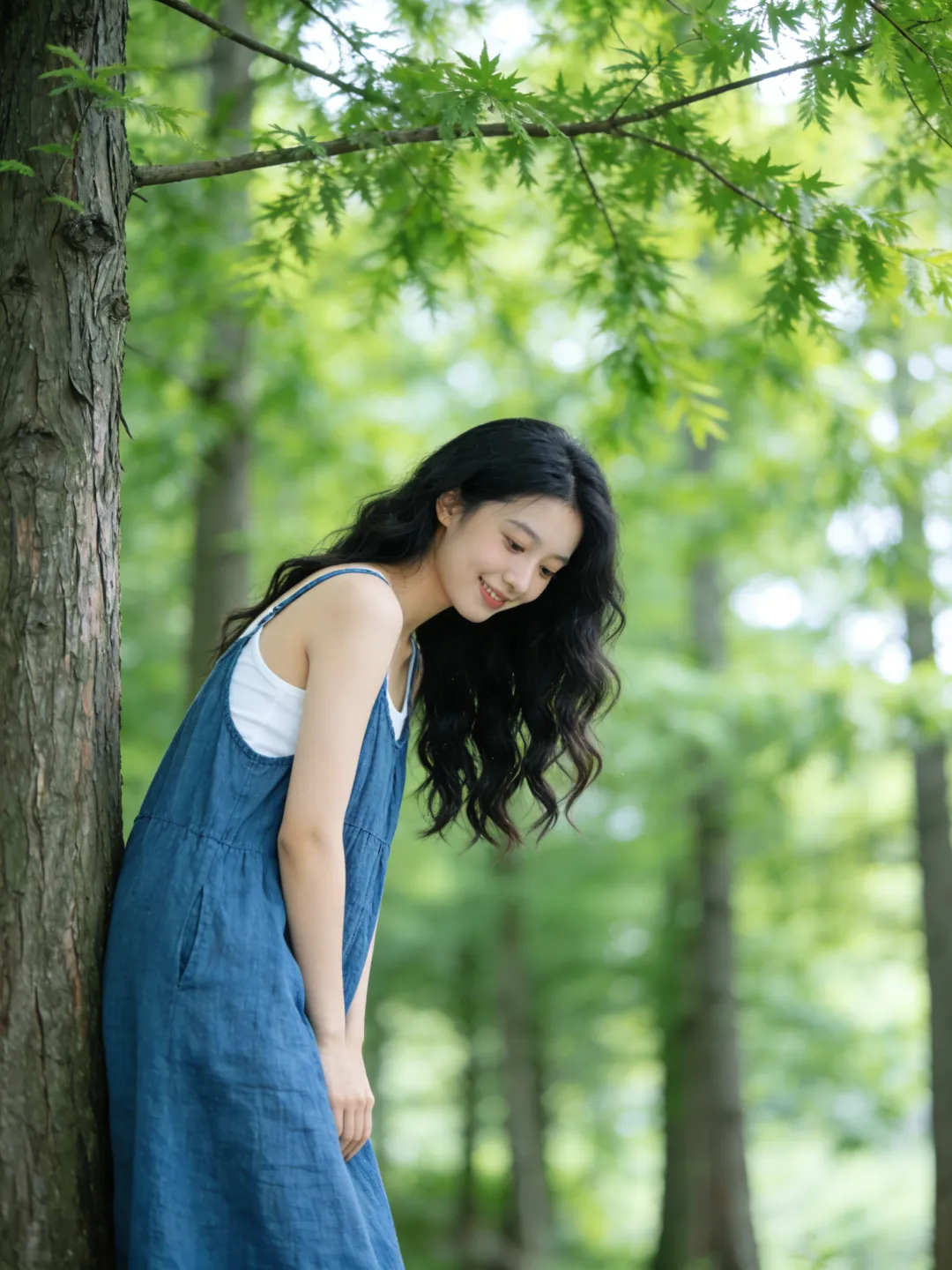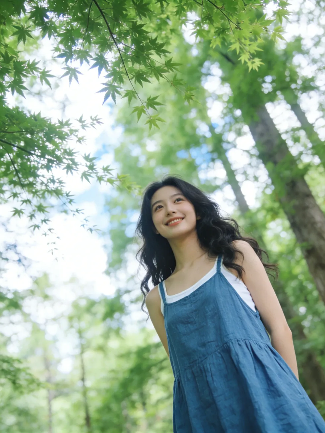 提示词:帮我生成8张图片:东亚 20 岁清纯甜妹,鹅蛋脸杏眼微笑,黑长波浪卷发,清透伪素颜,莫迪蓝棉麻吊带裙内搭白吊带,森林绿色枫树场景,背景树林虚化,日系清新森系人像,8K 高清,大光圈虚化,青绿色调滤镜,通透光影,电影感构图。人物全身入境,人物在画面的占比20%。更多不同的姿势和构图全身扶树看远方 回头笑抓拍 前景虚化半身 逆光发丝特写 走在林间小路 侧身靠树低头 捧树叶近景 仰拍天空 + 人物,比例 「3:4」