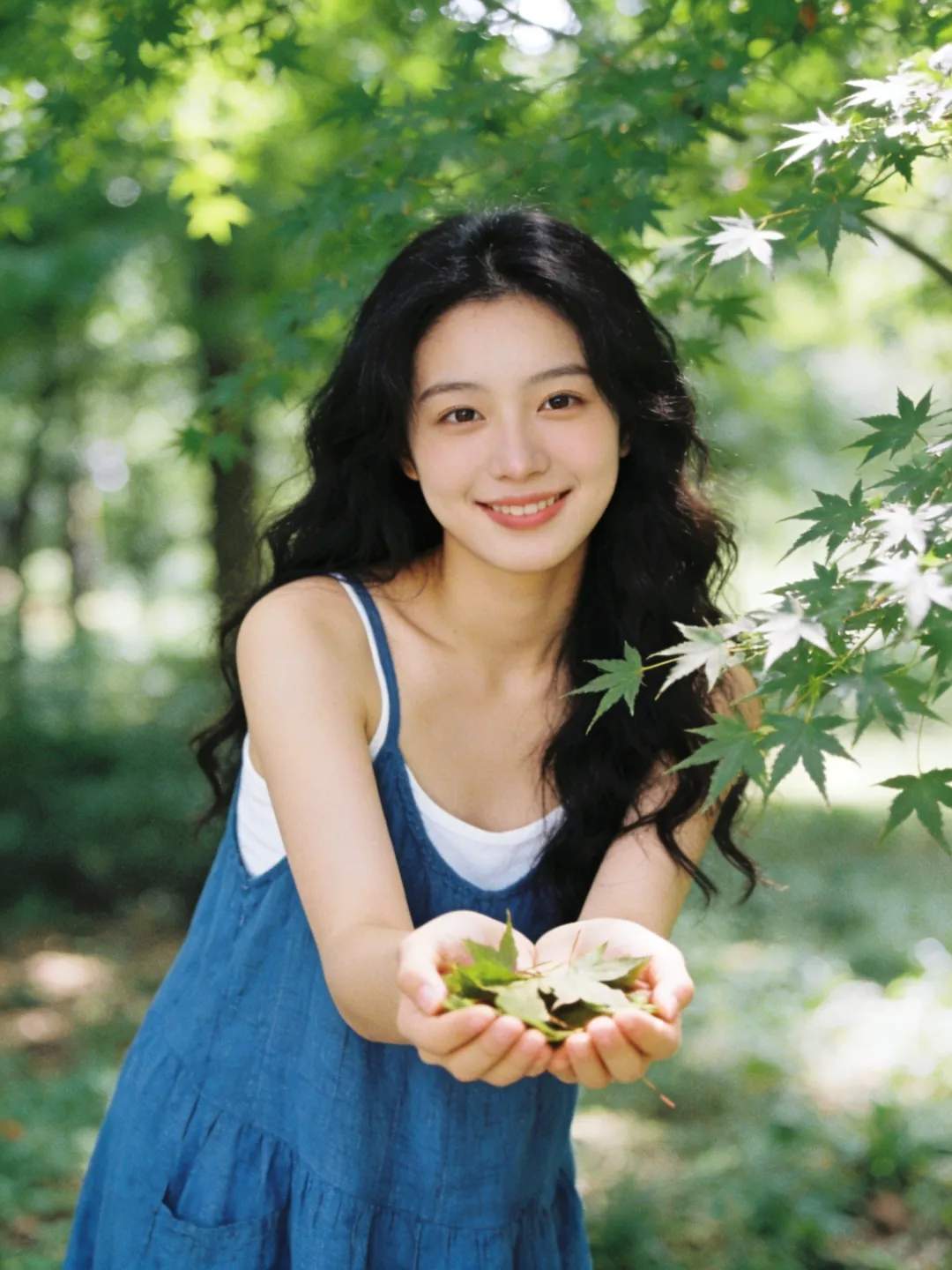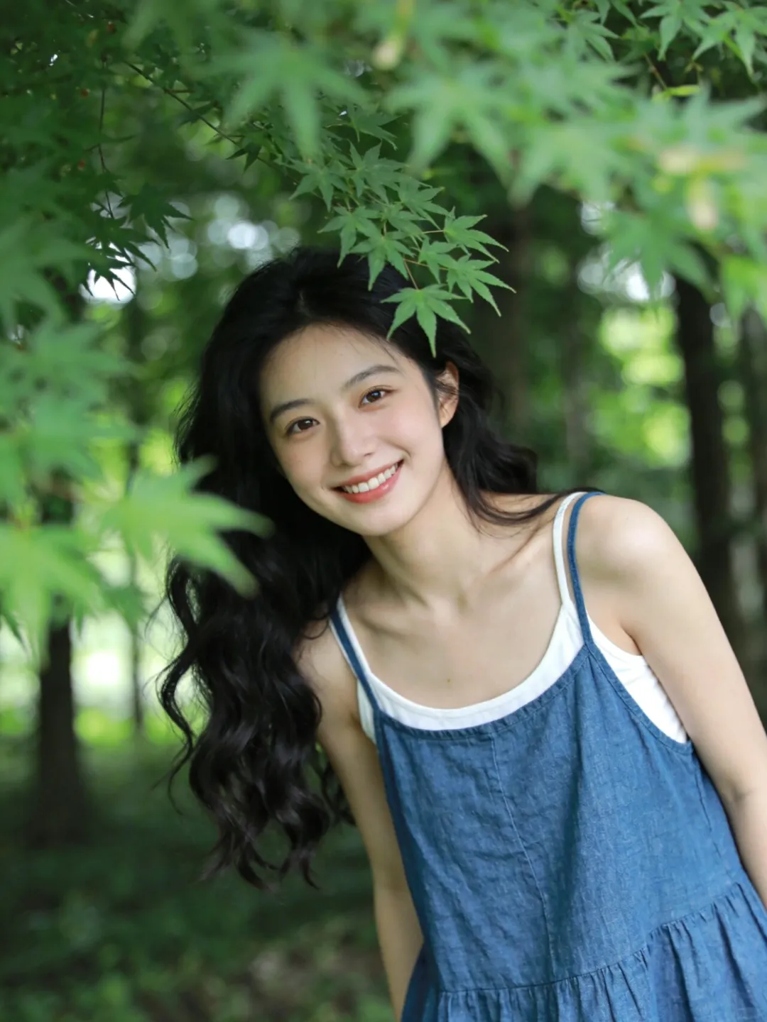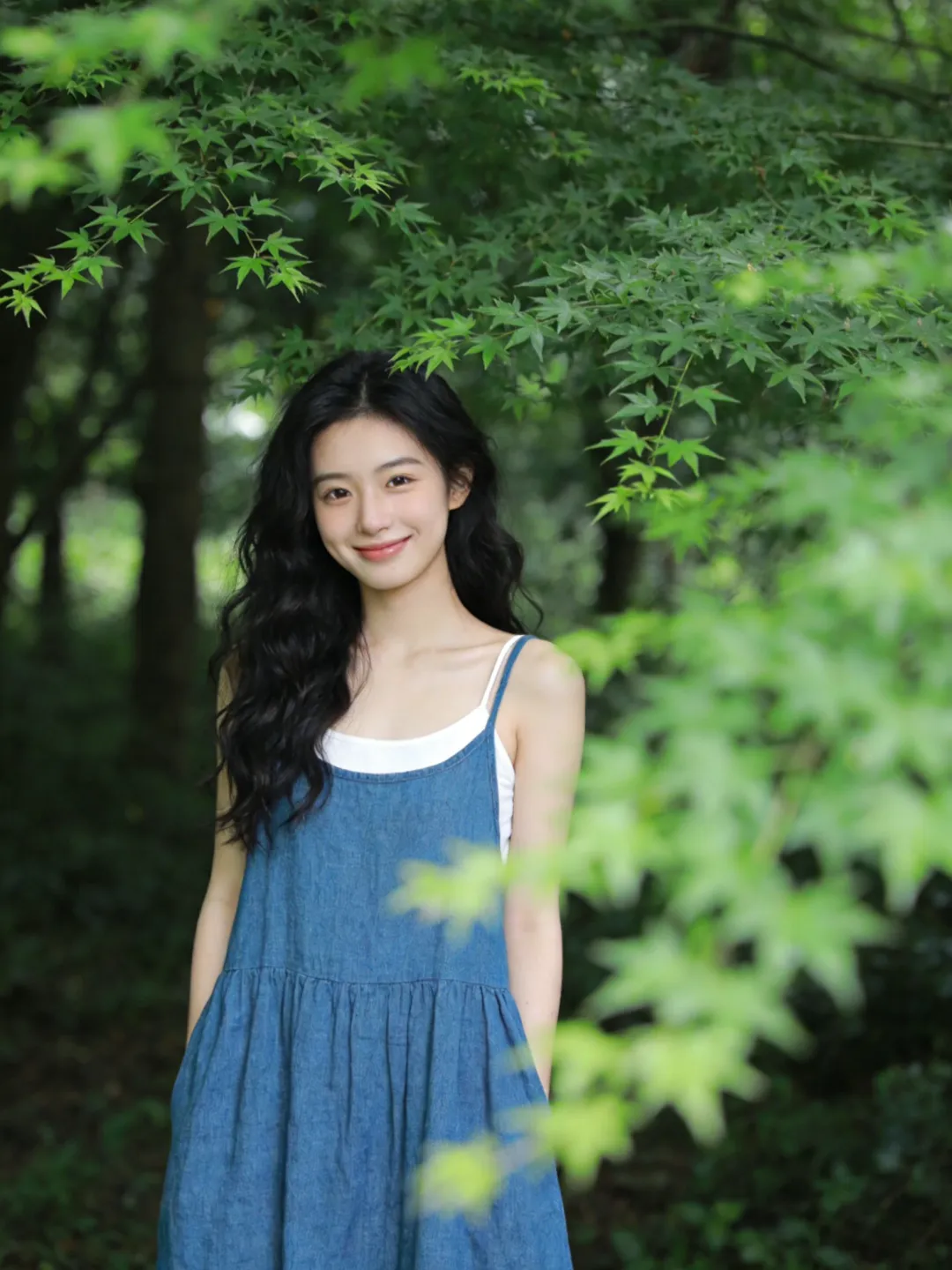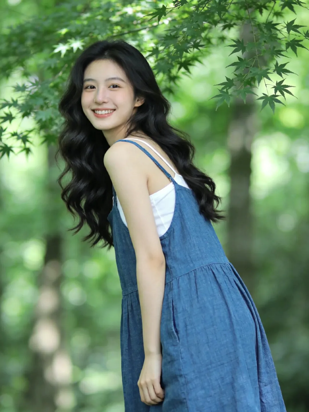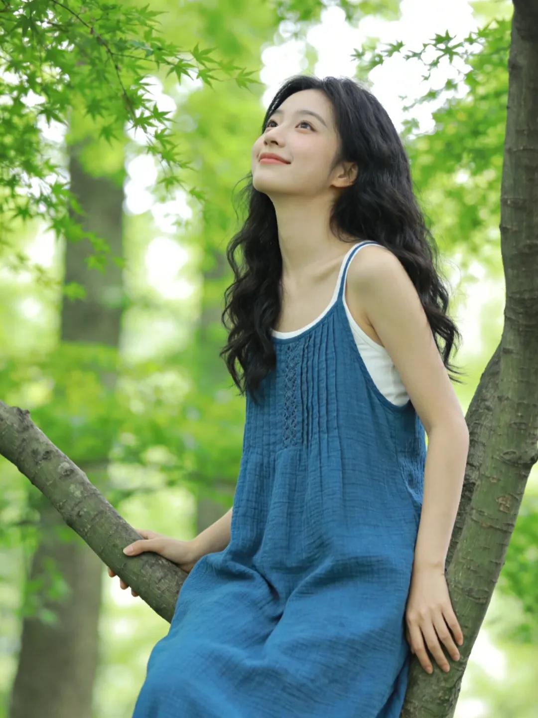 提示词:帮我生成8张图片:东亚 20 岁清纯甜妹,鹅蛋脸杏眼微笑,黑长波浪卷发,清透伪素颜,莫迪蓝棉麻吊带裙内搭白吊带,森林绿色枫树场景,背景树林虚化,日系清新森系人像,8K 高清,大光圈虚化,青绿色调滤镜,通透光影,电影感构图。人物全身入境,人物在画面的占比20%。更多不同的姿势和构图全身扶树看远方 回头笑抓拍 前景虚化半身 逆光发丝特写 走在林间小路 侧身靠树低头 捧树叶近景 仰拍天空 + 人物,比例 「3:4」