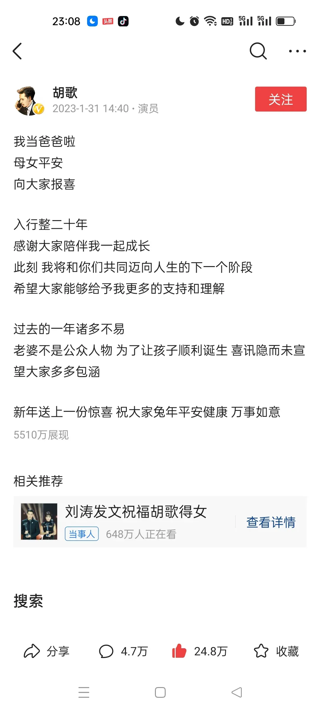 2023年1月31日,胡歌自爆隐婚喜得爱女升格当爸。这个今天娱乐圈最大的瓜,让我手机被各类APP消息弹窗轰炸了个结实。