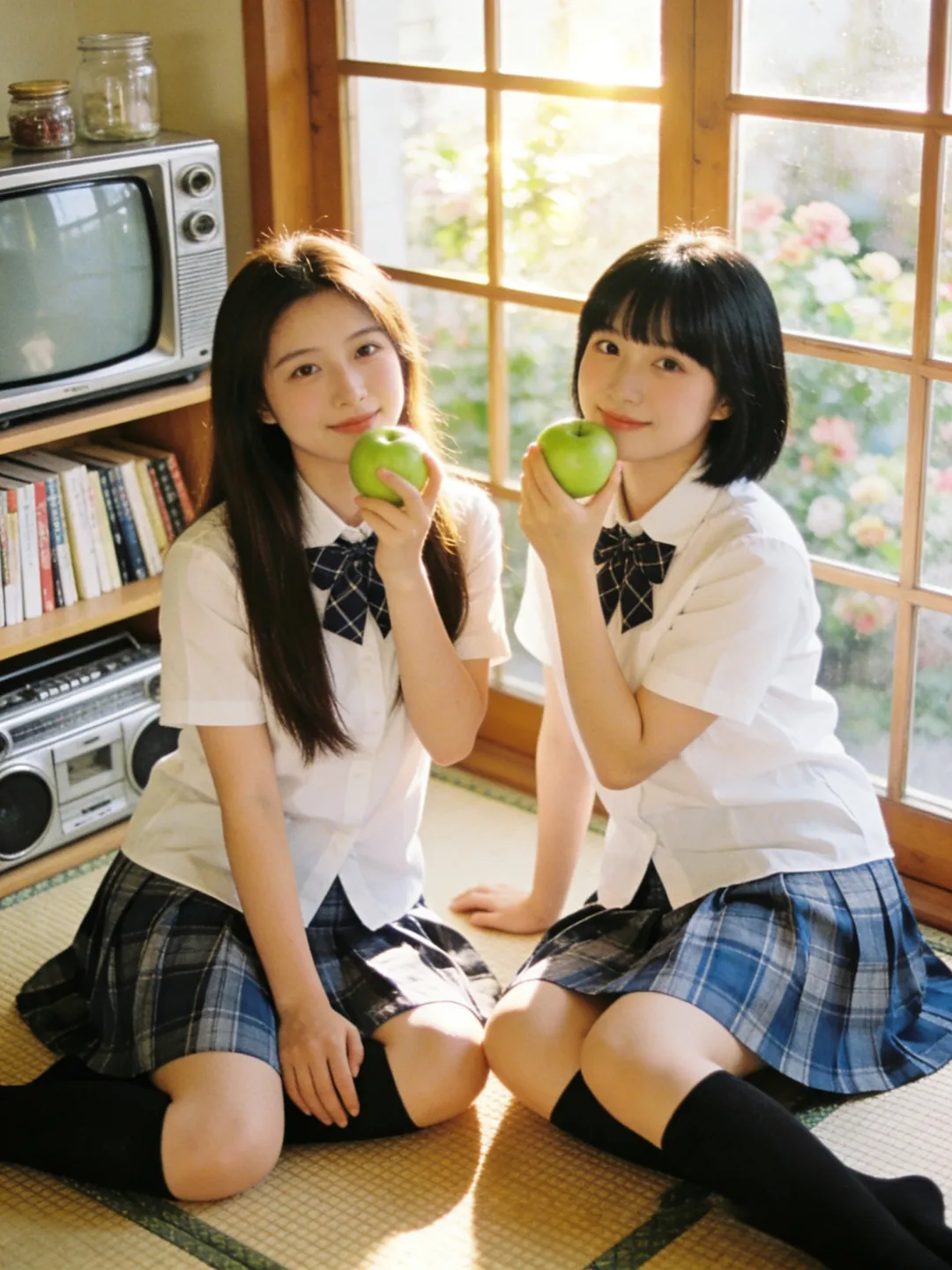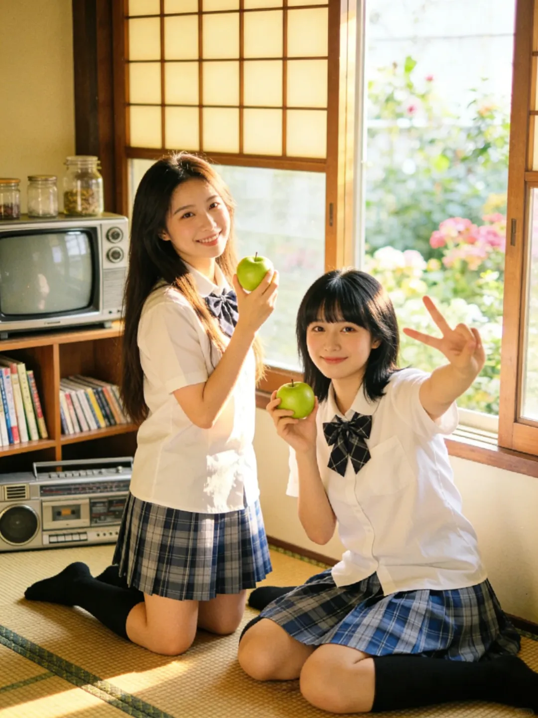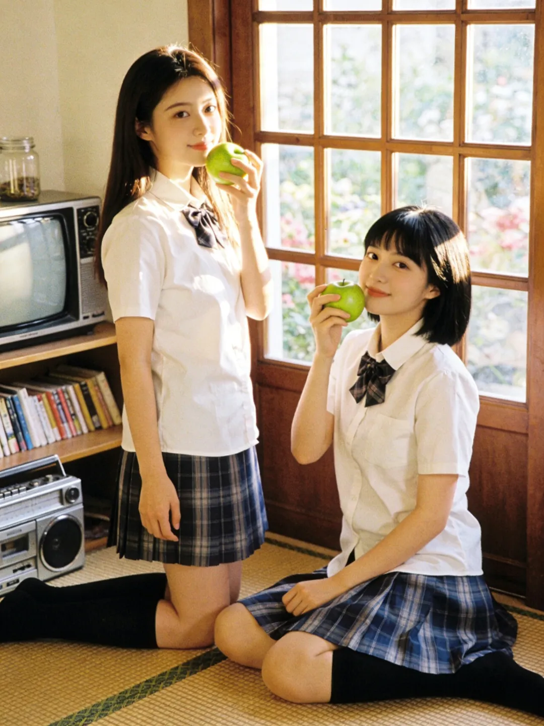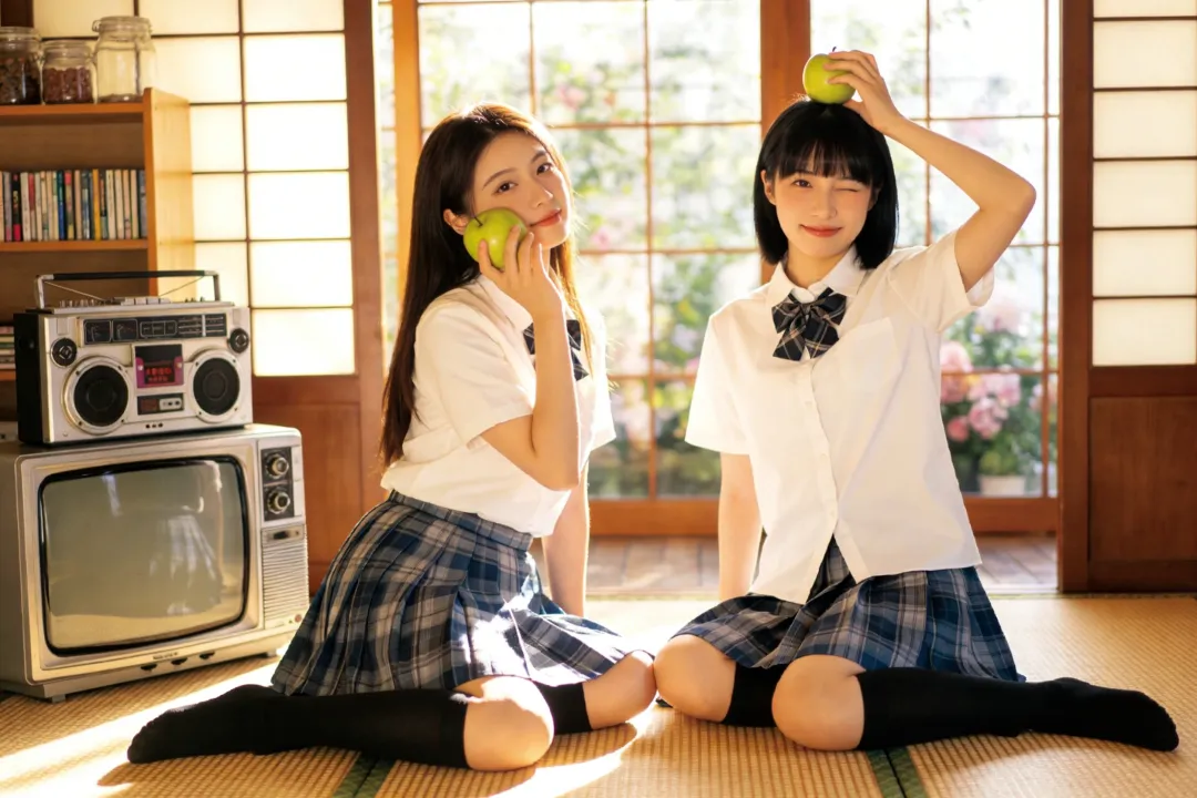 提示词:帮我生成图片:两位身穿白色短袖衬衫、系着藏青色格子领结的少女,下半身穿着蓝灰格纹百褶裙,搭配黑色及膝长袜。场景位于复古风格的日式房间内,地面铺设编织榻榻米。背景是一扇木质格纹窗户,窗外可见模糊的绿植与花卉。左侧摆放着一台老式 CRT 电视机和银色收录一体机,旁边的木质架子上整齐摆放着书籍与玻璃罐,整体环境温馨复古,充满生活气息。柔和的自然侧逆光(黄金时刻光线),透过窗户洒在人物身上,形成温暖的光晕和柔和的阴影。整体色调呈现经典的日系胶片感,偏暖调,带有轻微的复古颗粒感,色彩饱和度适中,高光泽感,营造出清新、治愈、甜美的夏日氛围。8K 分辨率,超高细节,精致的面部和五官刻画,皮肤质感自然,专业摄影,构图优美,浅景深效果。8K 高清,两位身穿白色衬衫和蓝灰格纹百褶裙的少女,黑色及膝长袜,复古日式房间,榻榻米,木质格窗,老式电视机和收录机,柔和自然侧逆光,暖色调,日系胶片风,复古颗粒感,清新治愈,甜美氛围,专业摄影。左边少女留着深棕色长直发;右边少女留着齐刘海黑发。每个人手里拿着一个青苹果,摆各种不同的动作姿势