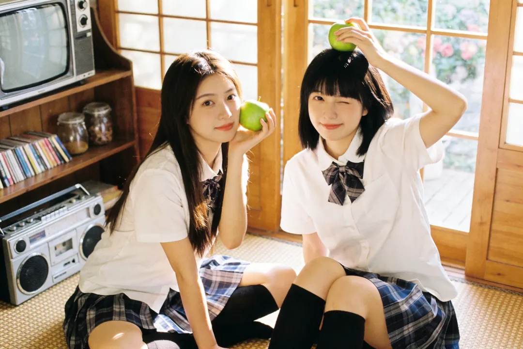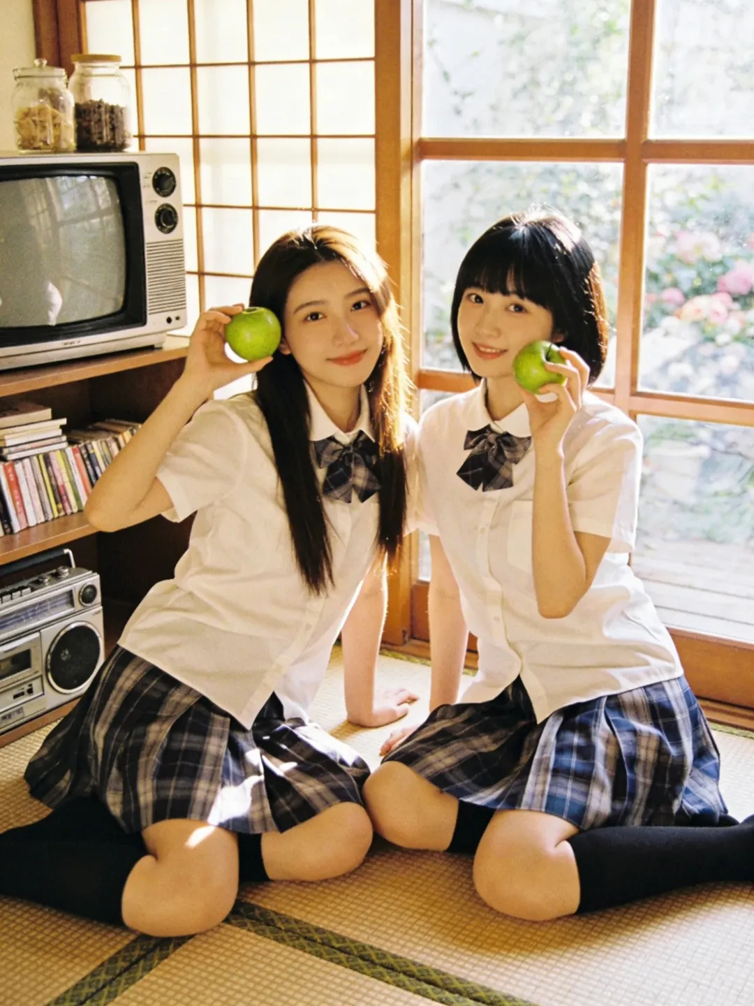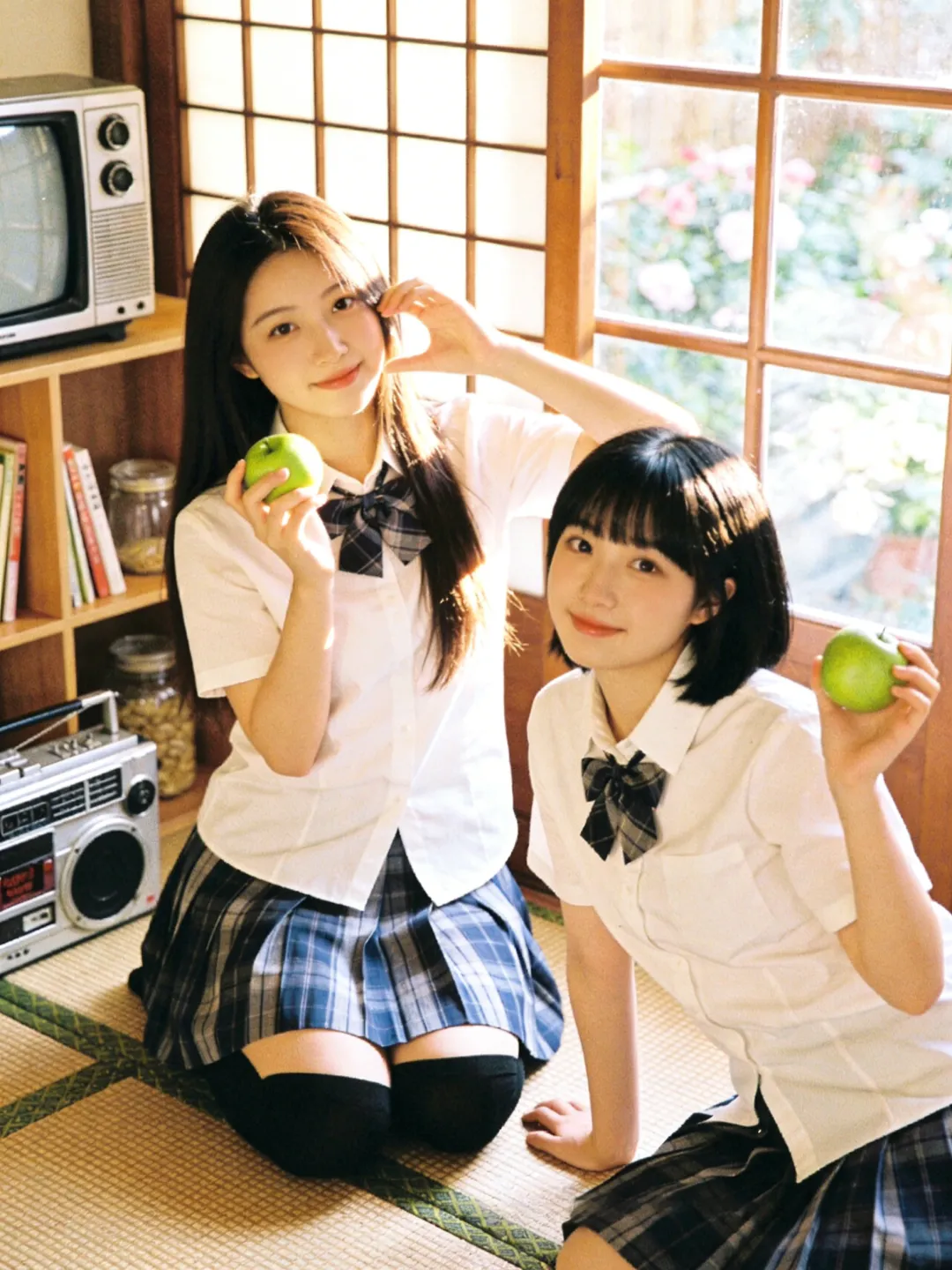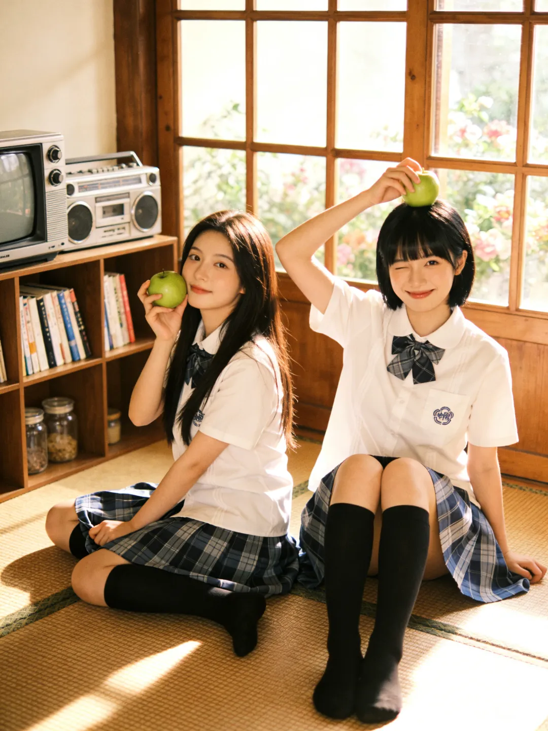 提示词:帮我生成图片:两位身穿白色短袖衬衫、系着藏青色格子领结的少女,下半身穿着蓝灰格纹百褶裙,搭配黑色及膝长袜。场景位于复古风格的日式房间内,地面铺设编织榻榻米。背景是一扇木质格纹窗户,窗外可见模糊的绿植与花卉。左侧摆放着一台老式 CRT 电视机和银色收录一体机,旁边的木质架子上整齐摆放着书籍与玻璃罐,整体环境温馨复古,充满生活气息。柔和的自然侧逆光(黄金时刻光线),透过窗户洒在人物身上,形成温暖的光晕和柔和的阴影。整体色调呈现经典的日系胶片感,偏暖调,带有轻微的复古颗粒感,色彩饱和度适中,高光泽感,营造出清新、治愈、甜美的夏日氛围。8K 分辨率,超高细节,精致的面部和五官刻画,皮肤质感自然,专业摄影,构图优美,浅景深效果。8K 高清,两位身穿白色衬衫和蓝灰格纹百褶裙的少女,黑色及膝长袜,复古日式房间,榻榻米,木质格窗,老式电视机和收录机,柔和自然侧逆光,暖色调,日系胶片风,复古颗粒感,清新治愈,甜美氛围,专业摄影。左边少女留着深棕色长直发;右边少女留着齐刘海黑发。每个人手里拿着一个青苹果,摆各种不同的动作姿势