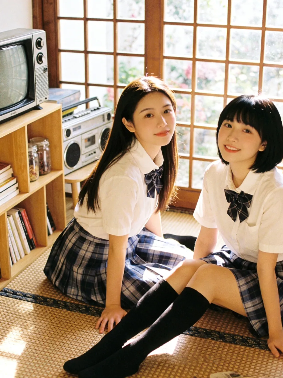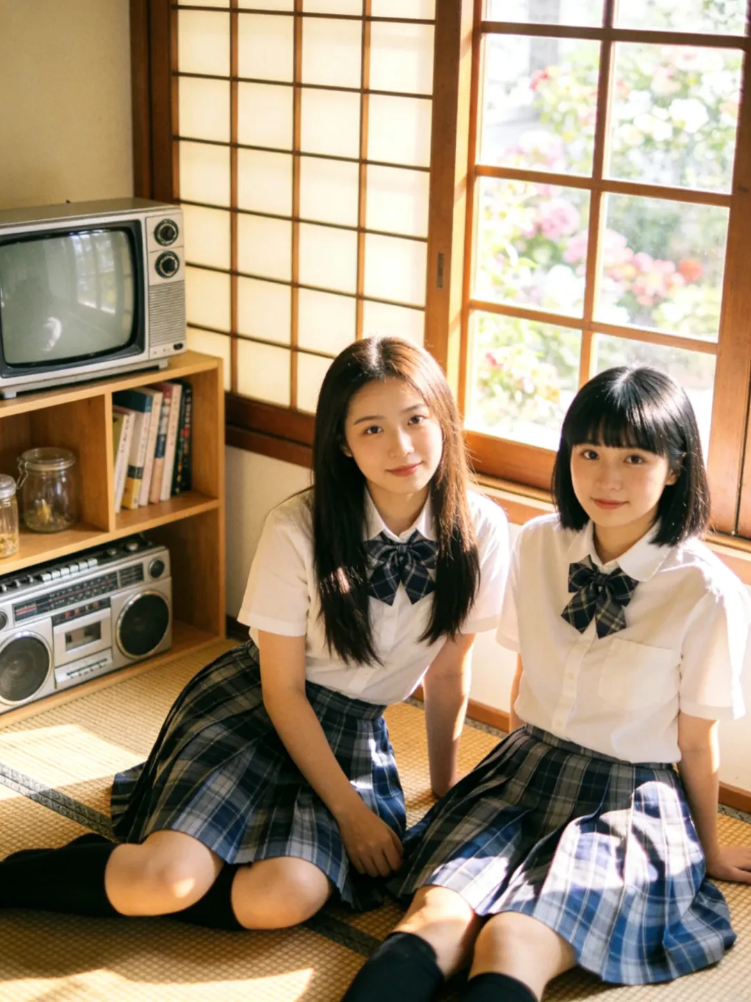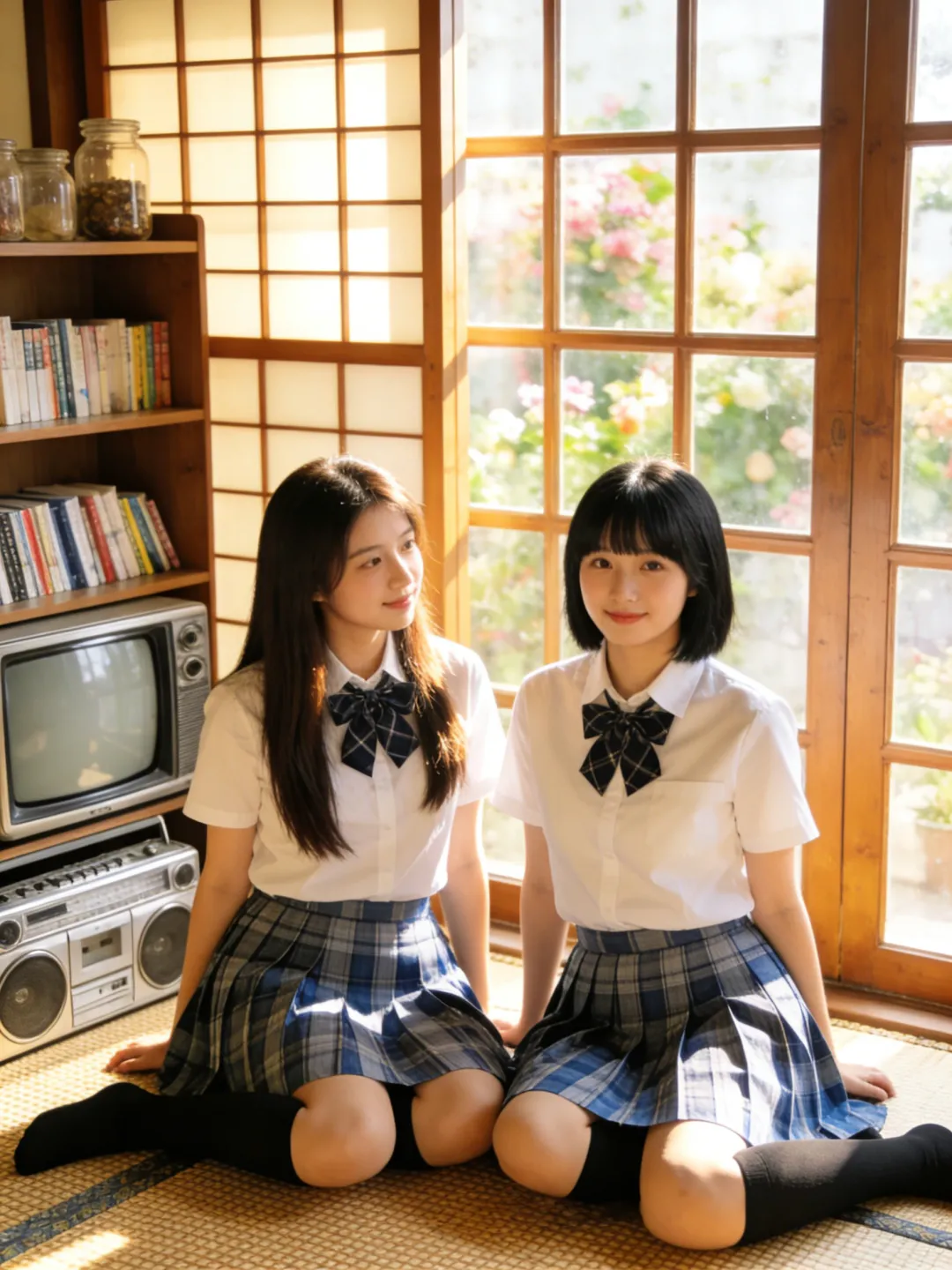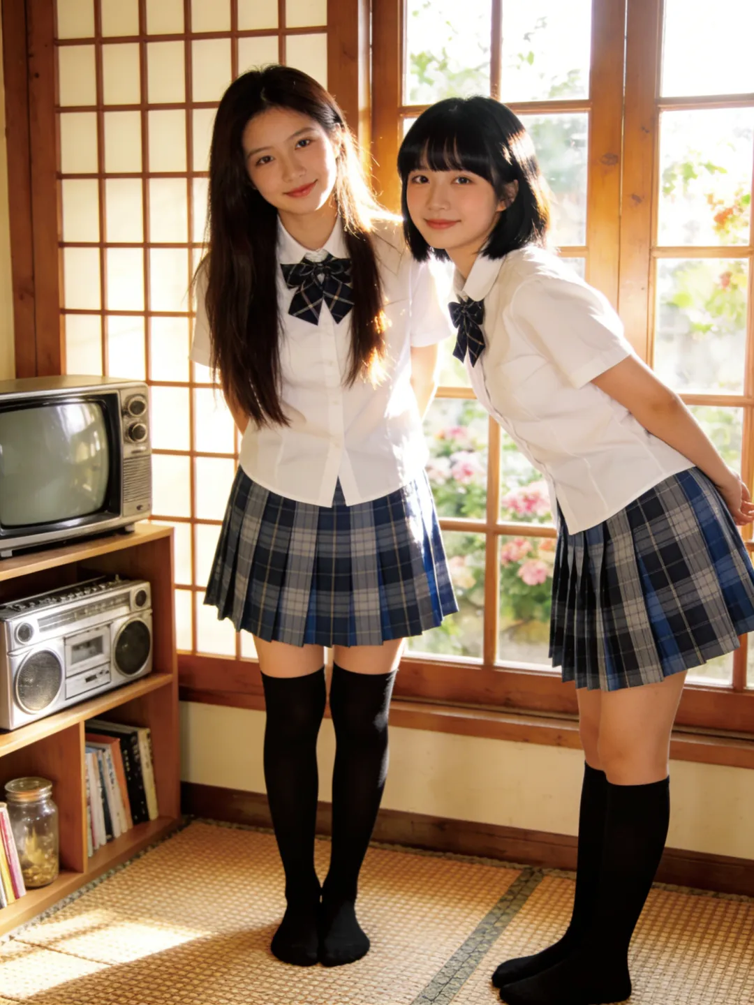 提示词:帮我生成图片:两位身穿白色短袖衬衫、系着藏青色格子领结的少女,下半身穿着蓝灰格纹百褶裙,搭配黑色及膝长袜。场景位于复古风格的日式房间内,地面铺设编织榻榻米。背景是一扇木质格纹窗户,窗外可见模糊的绿植与花卉。左侧摆放着一台老式 CRT 电视机和银色收录一体机,旁边的木质架子上整齐摆放着书籍与玻璃罐,整体环境温馨复古,充满生活气息。柔和的自然侧逆光(黄金时刻光线),透过窗户洒在人物身上,形成温暖的光晕和柔和的阴影。整体色调呈现经典的日系胶片感,偏暖调,带有轻微的复古颗粒感,色彩饱和度适中,高光泽感,营造出清新、治愈、甜美的夏日氛围。8K 分辨率,超高细节,精致的面部和五官刻画,皮肤质感自然,专业摄影,构图优美,浅景深效果。8K 高清,两位身穿白色衬衫和蓝灰格纹百褶裙的少女,黑色及膝长袜,复古日式房间,榻榻米,木质格窗,老式电视机和收录机,柔和自然侧逆光,暖色调,日系胶片风,复古颗粒感,清新治愈,甜美氛围,专业摄影。左边少女留着深棕色长直发;右边少女留着齐刘海黑发。每个人手里拿着一个青苹果,摆各种不同的动作姿势