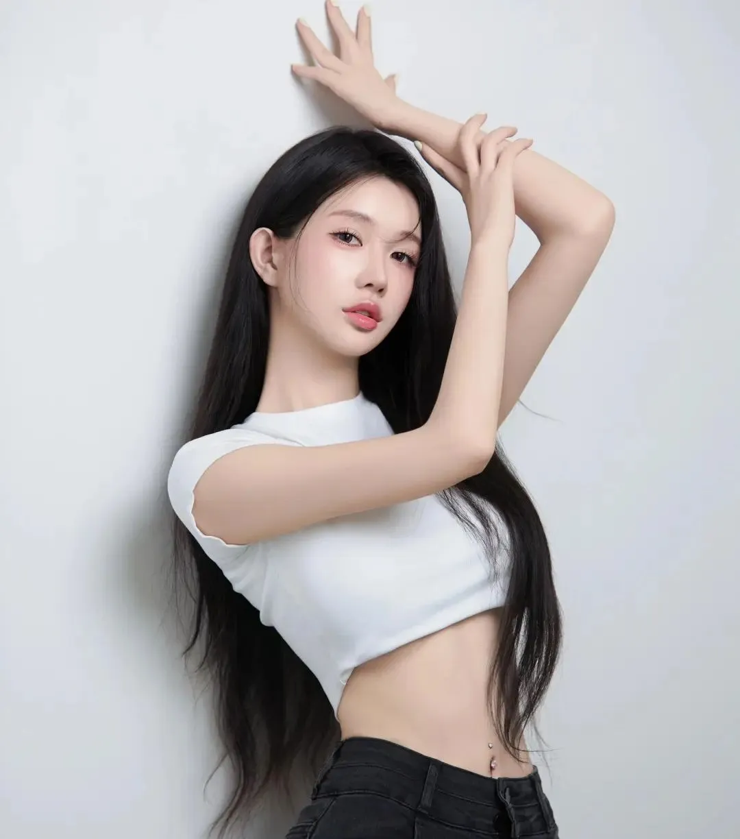 一只手抬起来放在头后或墙边,另一只手自然放在腰胯位置,身体顺势拉长。这个动作最适合用来打开上半身,肩颈会更舒展,腰也会显得更细。因为手臂被抬起,整个人的比例会被拉得很好,特别容易拍出高挑感。氛围上会偏一点随性和时髦,很适合拍白墙写真。