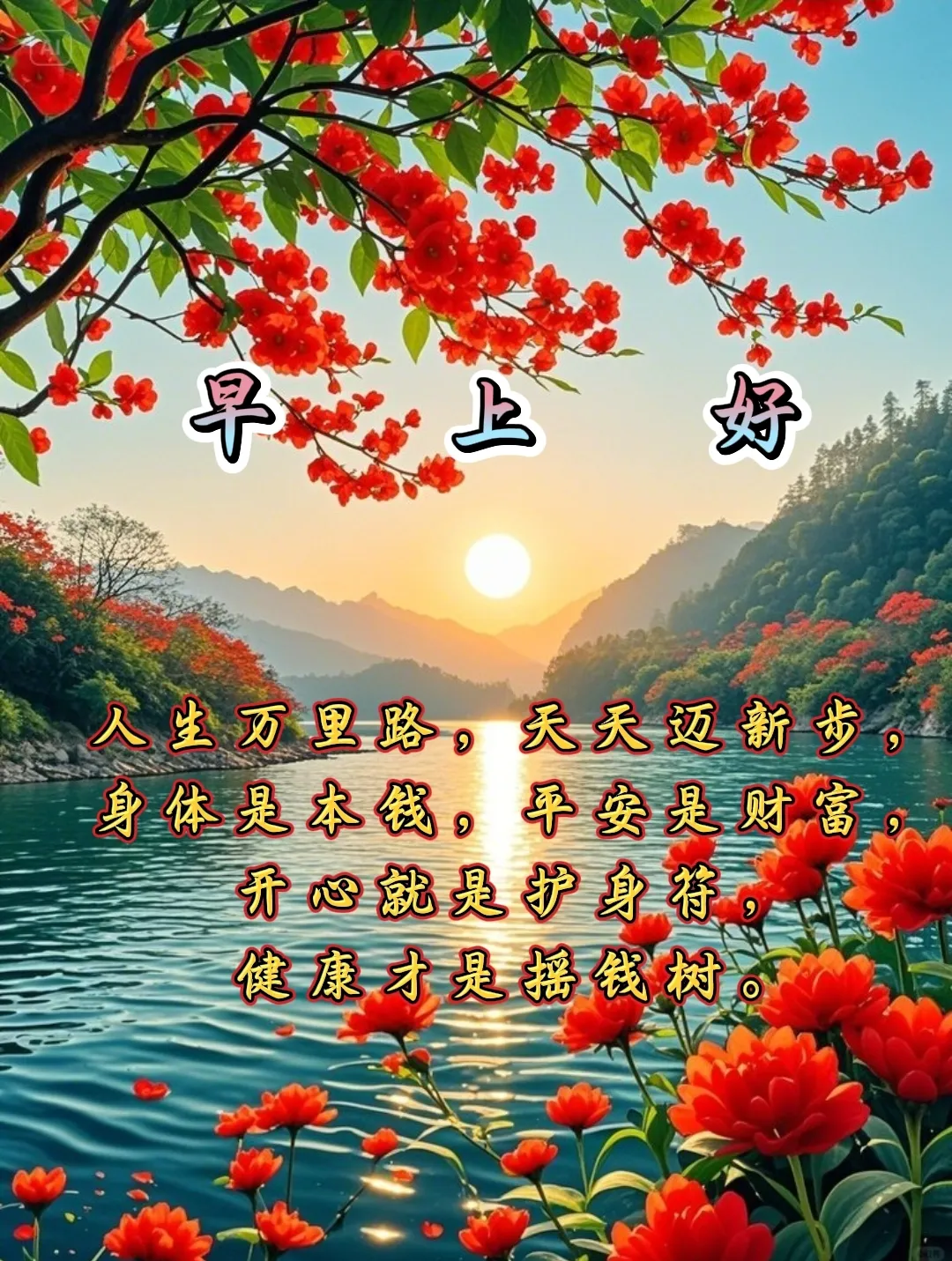 ☀️快乐是最美的风景,心有桃花源,处处水云间;💖健康是最美好的幸福,只要身体好,天天乐逍遥;🍭问候是最真挚的情意,你开心我就快乐,你幸福我就满足!早上好!🌹😊❤🙏☀🎉