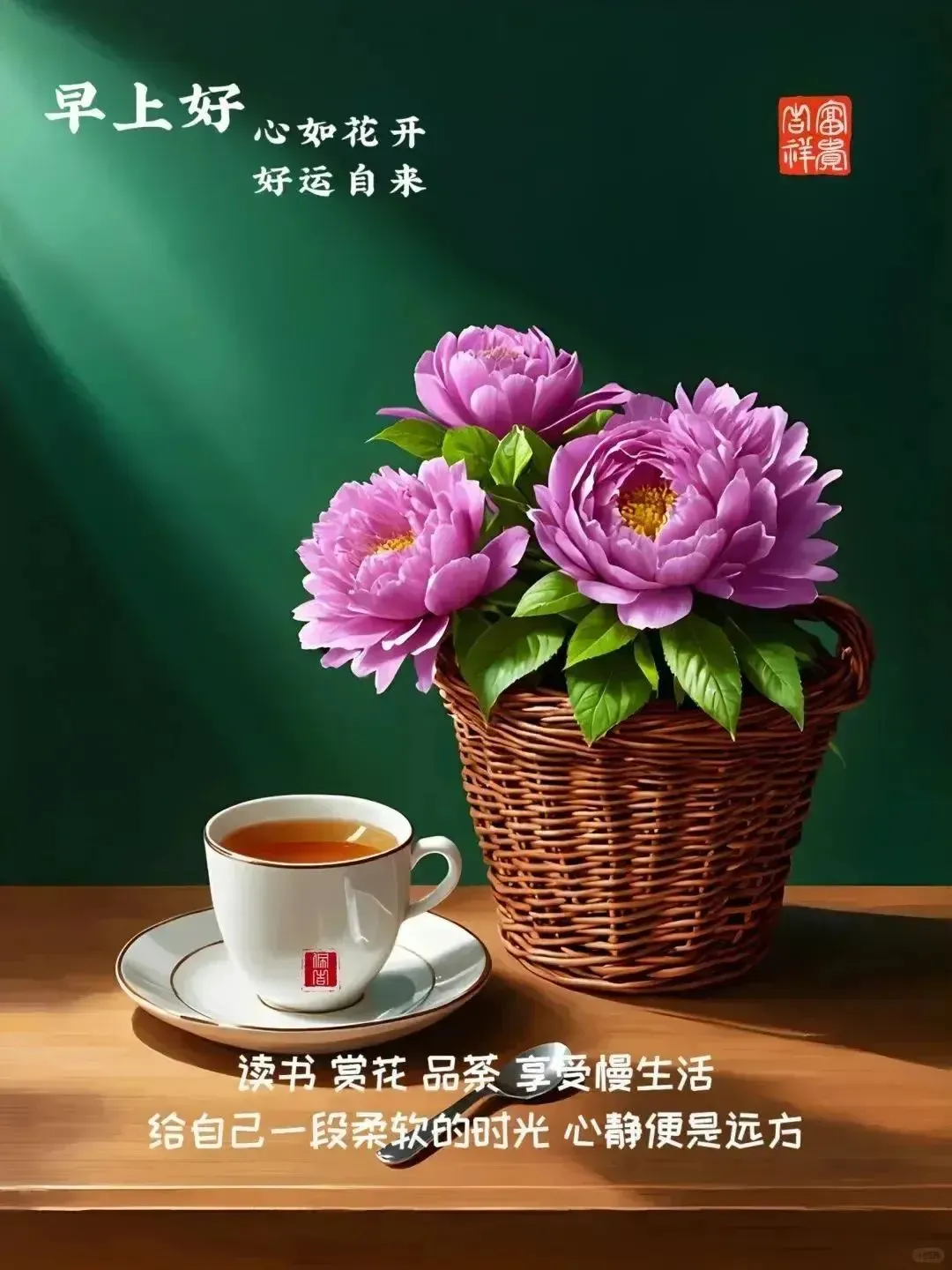 22,慢品人生,细品茶,开心路上度年华,每日悠闲聊佳话,留下健康看晚霞,生命就是一朵花,静静地开,悄悄地落,这一路我们慢慢走,细细品,深深悟,方知平平安安才是真,健健康康才是福,早安!