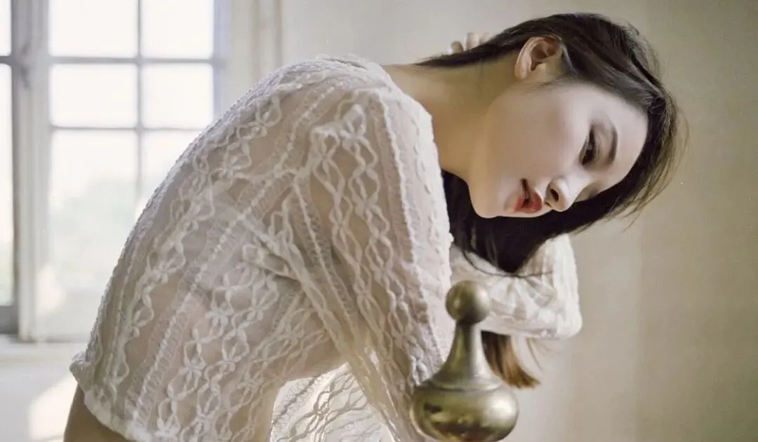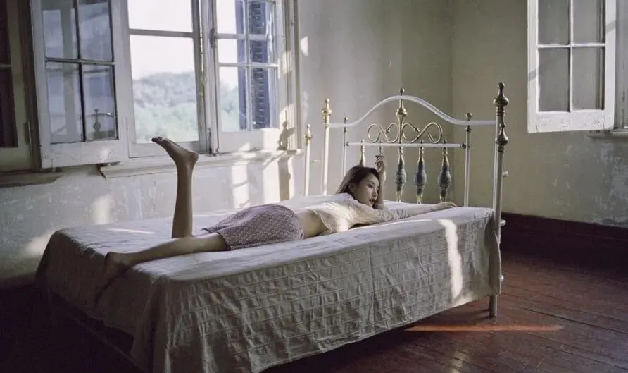 身体微微侧过去,肩膀自然前送一点,上半身轻轻往床边靠,头往下低,眼神不要太用力,手臂可以顺势搭着支撑点,整个人像是在发呆一样,这个动作很适合修饰肩颈和下颌线,侧脸会显得特别柔和,腰背线条也更明显,拍出来有一种安静又温柔的松弛感,很像电影里的居家片段,