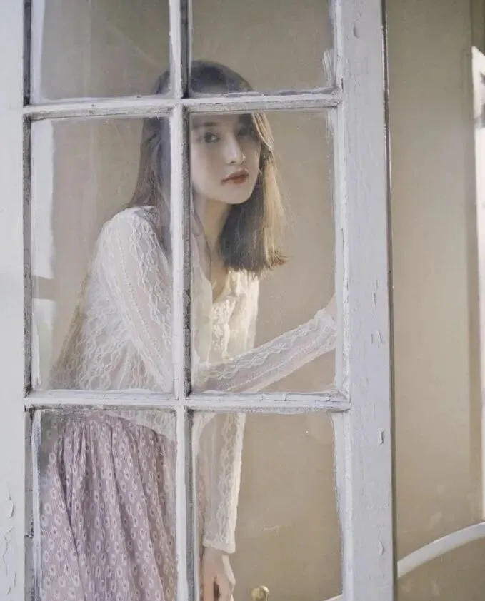 站在旧窗或玻璃门后面,不要站得太正,身体稍微往一侧偏一点,一只手扶着窗框,另一只手自然垂下,脸可以轻轻看向镜头,也可以看远一点,表情淡淡的就够了,这样拍能把身形拉得更修长,窗框还能顺带衬出脸小和五官精致,整体画面会有一点故事感,自然,耐看,又很有氛围