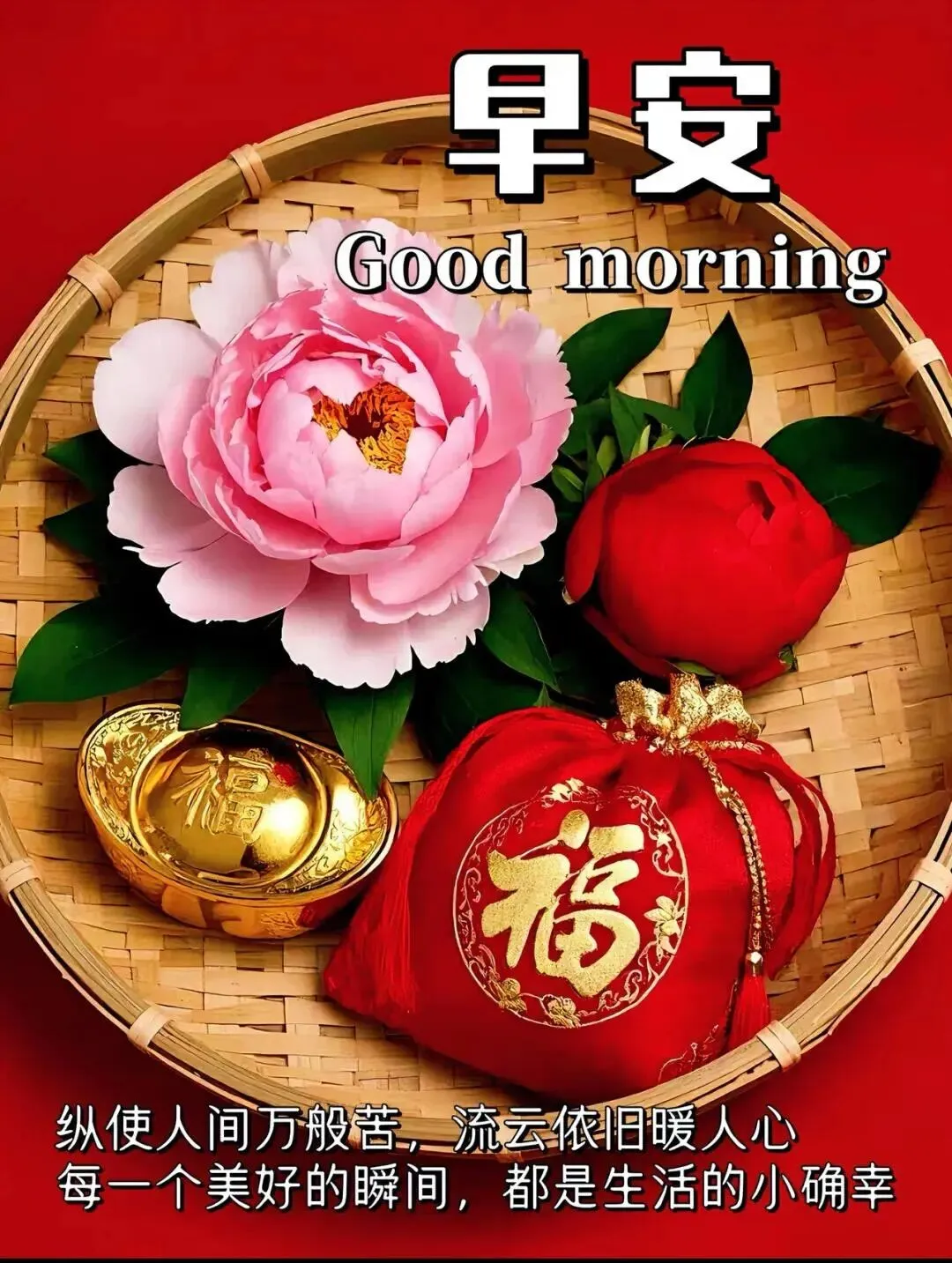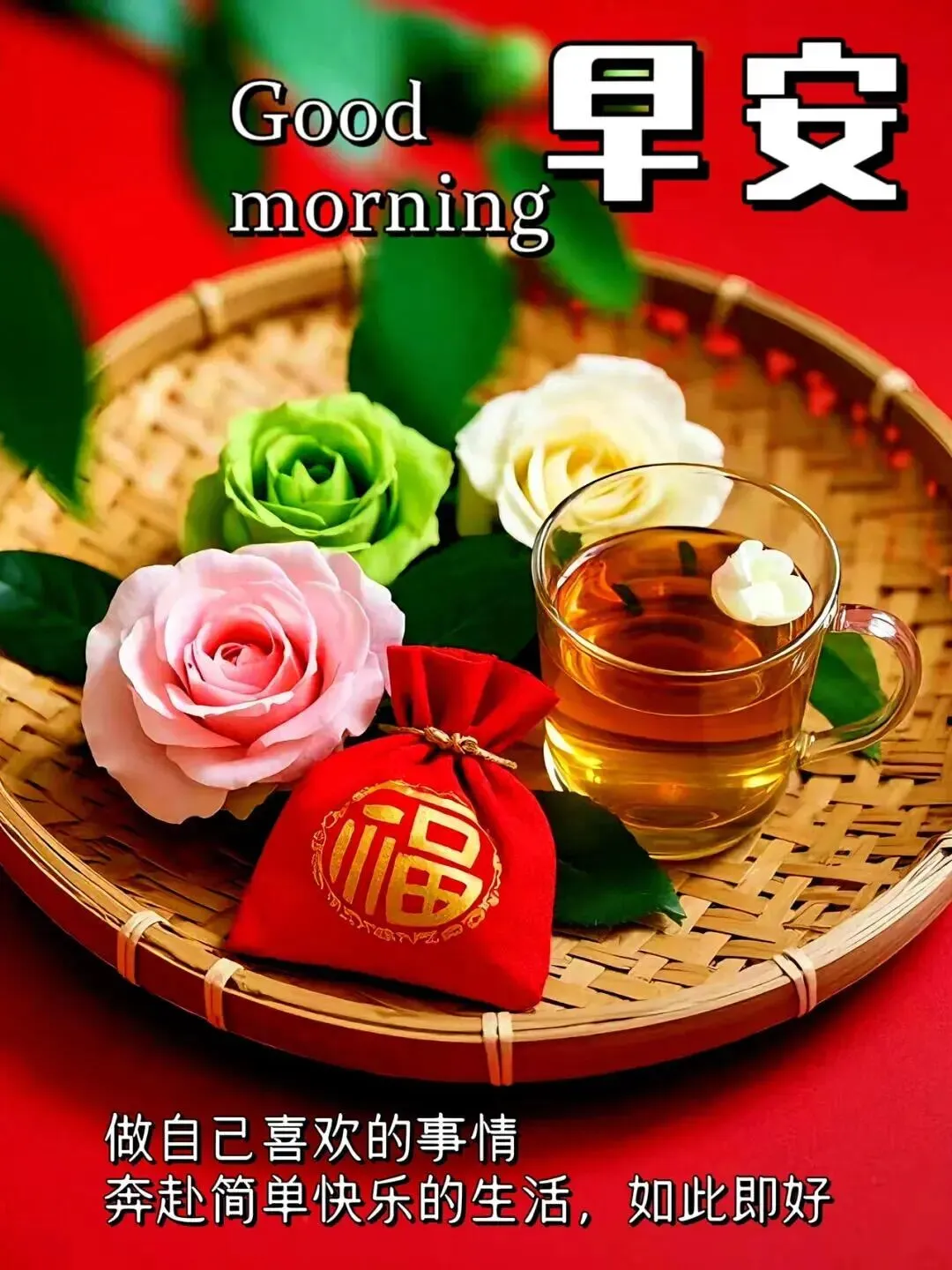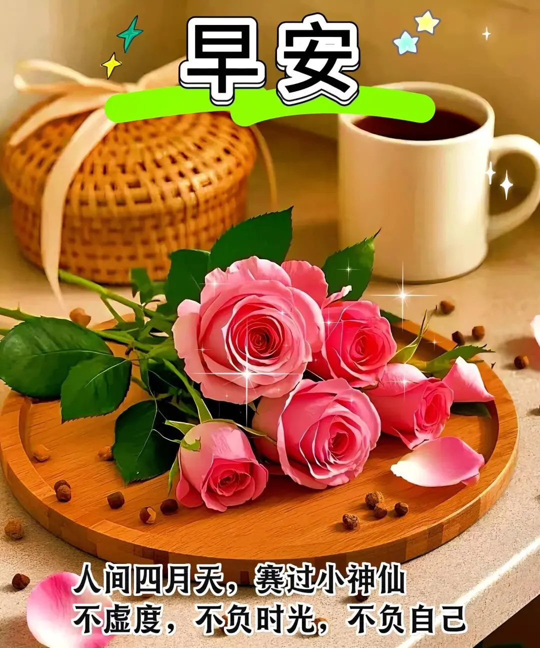 岁月静好心常安,晨光满面福满园;邻里谈笑添欢愉,庭院漫步身康健;愿您幸福常相伴,吉祥如意每一天。早安!🌹😊❤️🌺☕️🎉