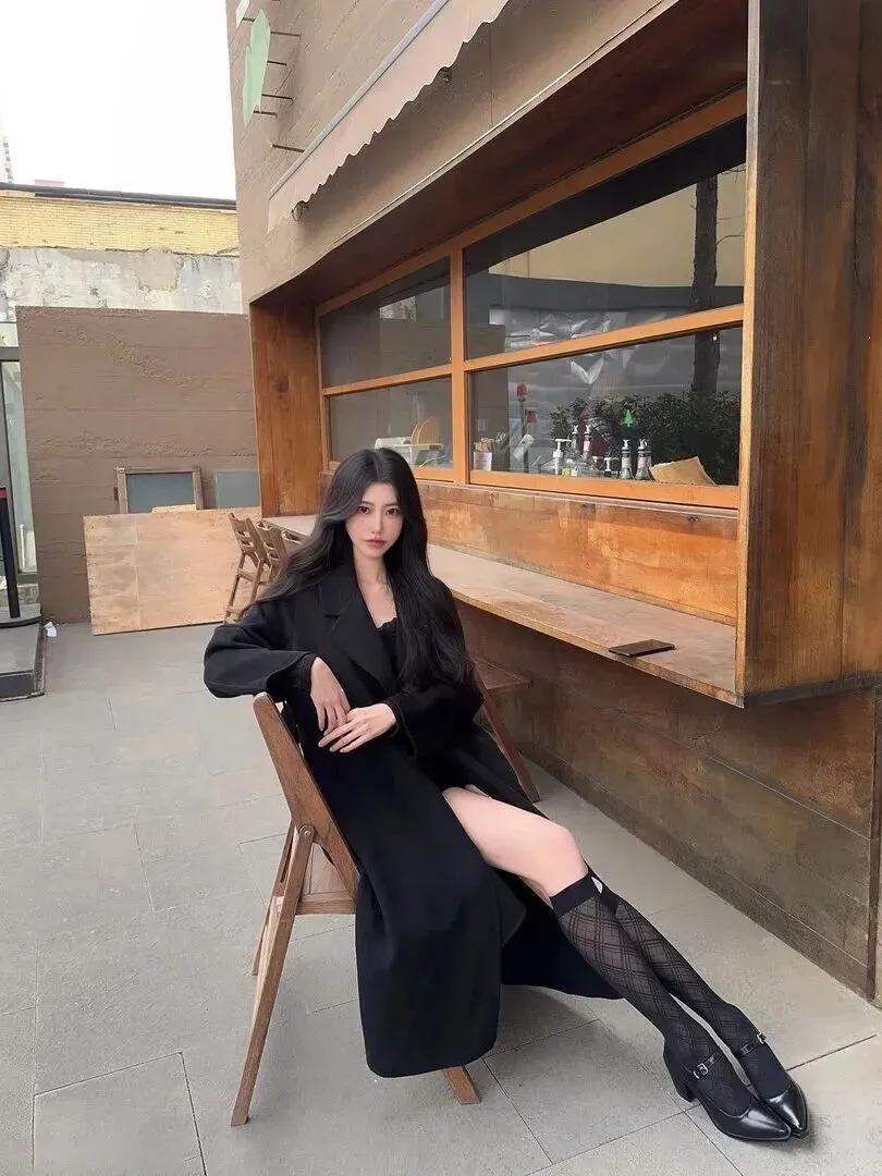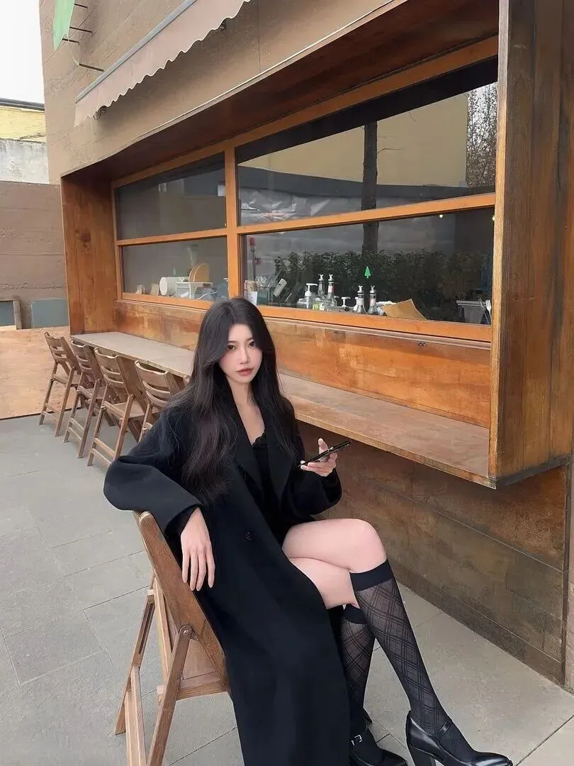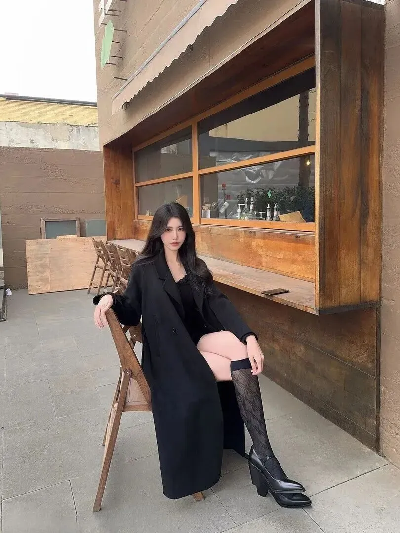 第一套就是法式慵懒风。选一件垂坠感很好的黑色毛呢大衣,内搭蕾丝上衣,外穿菱格纹过膝袜和亮面小皮鞋。整个人轻盈地、端庄地站在这儿,在巴黎街头随意地走着。那种随性的劲儿太诱人了。