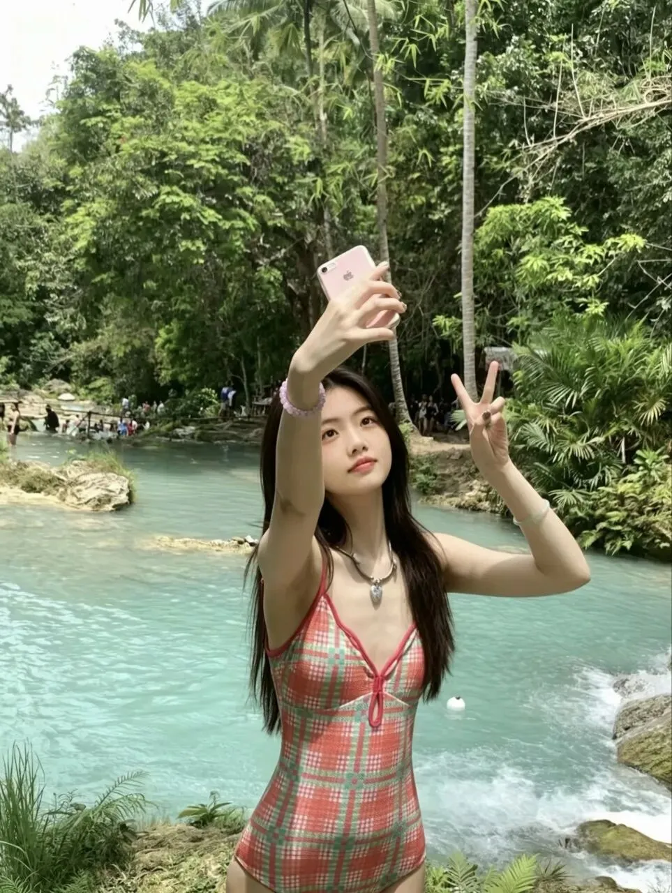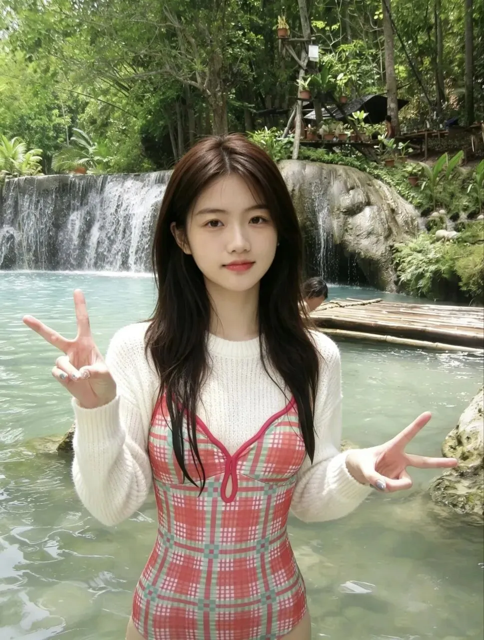 同行的朋友在不远处拍照,镜头里的我,穿着红白格纹的泳衣,长发被泉水打湿,贴在肩头,对着镜头比出可爱的手势,眼里满是藏不住的笑意。春日的阳光落在脸上,把皮肤晒得暖暖的,泉水的凉意包裹着身体,一暖一凉之间,是最舒服的状态。不用刻意摆姿势,不用修图,原相机直出的每一张,都是春日里最鲜活的模样。