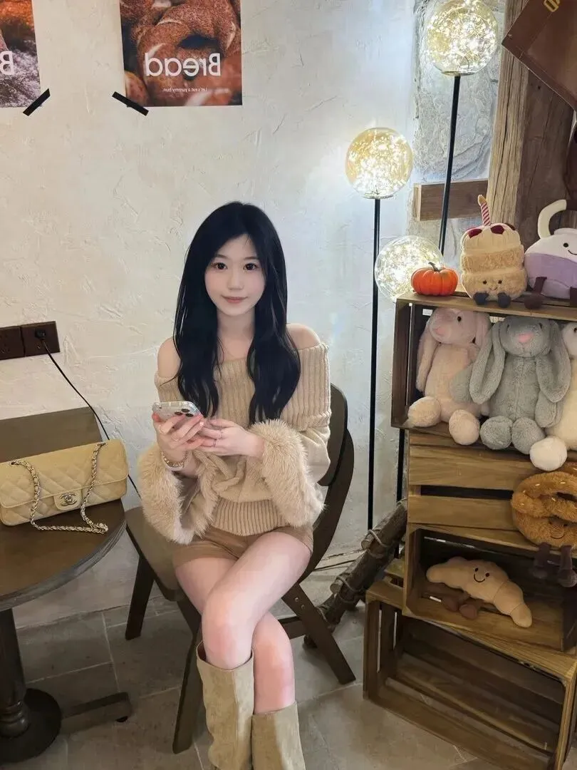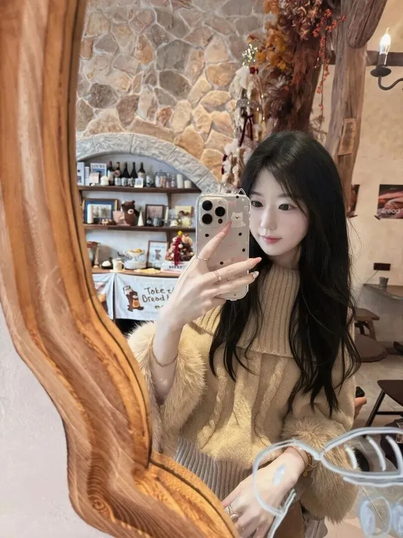这张照片里的她,戴一顶黑色贝雷帽,坐在木头椅上,选了一件浅卡其色的半高领针织上衣,还留着长长的棕色头发,脸上的妆容十分简单,只有淡淡的粉红色唇彩和修长的眼线。虽然绞花纹样看起来简单,但并没有因此变得乏味,宽大的领口装饰脖子线条显得非常典雅。暖色调的卡其色很显白,配上一头长长的卷发,韩剧女主的感觉就出来了!