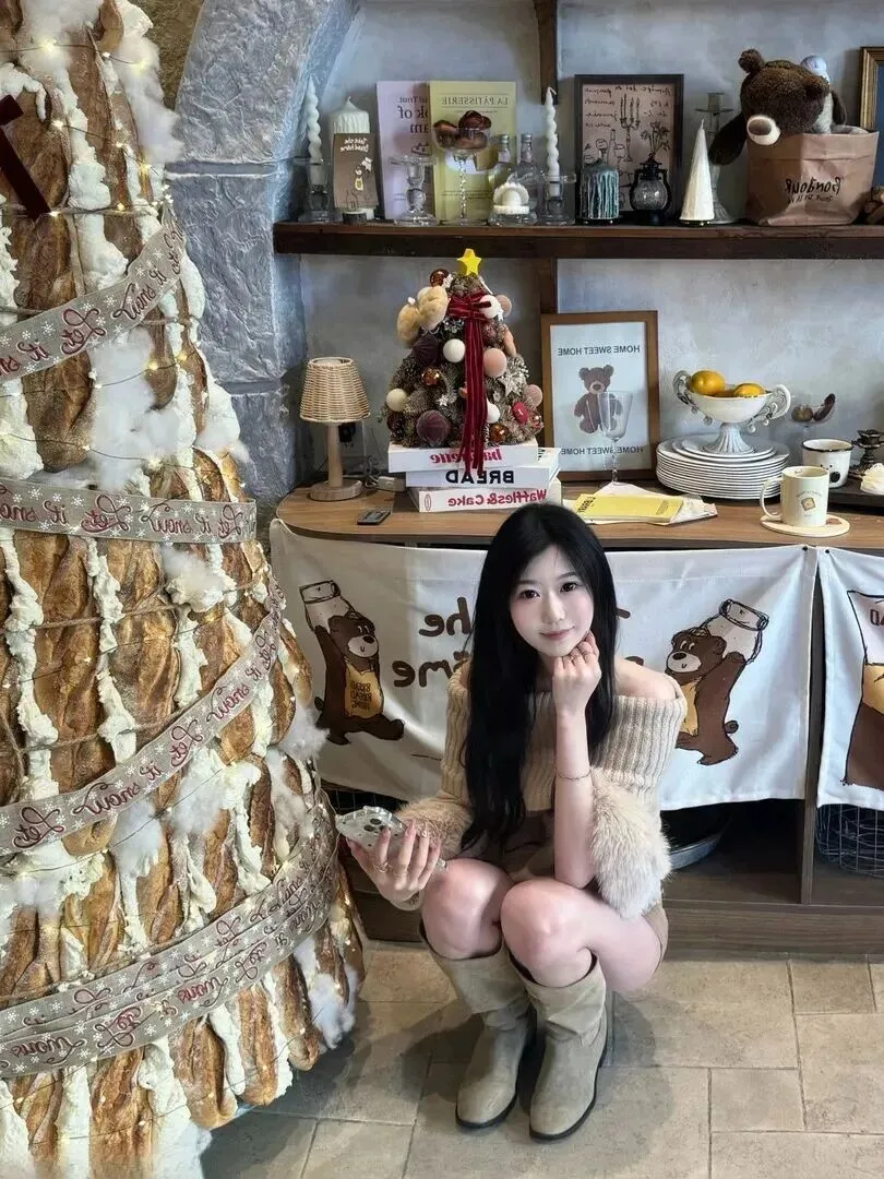 圣诞节的这一套是以浅卡其色长袖针织上衣配黑色短裤和棕色靴子的方式构成的,柔和而且符合节庆气氛。背景的圣诞树,搭配的衣服颜色太出色了,随便一张图片就是节日大片。