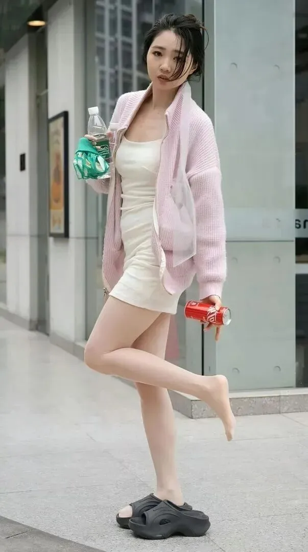 粉色粉嫩的开衫加上米白色裙摆,整个人就像被包裹在一股温柔光里。软糯的质感像是夏天傍晚的风拂过皮肤一样,让人舒服到不想动弹。领口微开,锁骨的轮廓隐现于衣身之上,是件针织衫。最妙的是开衫侧面那一层薄纱,走起路来飘飘荡荡,把那种懒洋洋的劲儿全带出来了。她一只脚着了拖鞋,另只脚不着地地翘起,一手提着一瓶饮料,那不经过思考而生出来的自得之气真是令人赏心悦目。