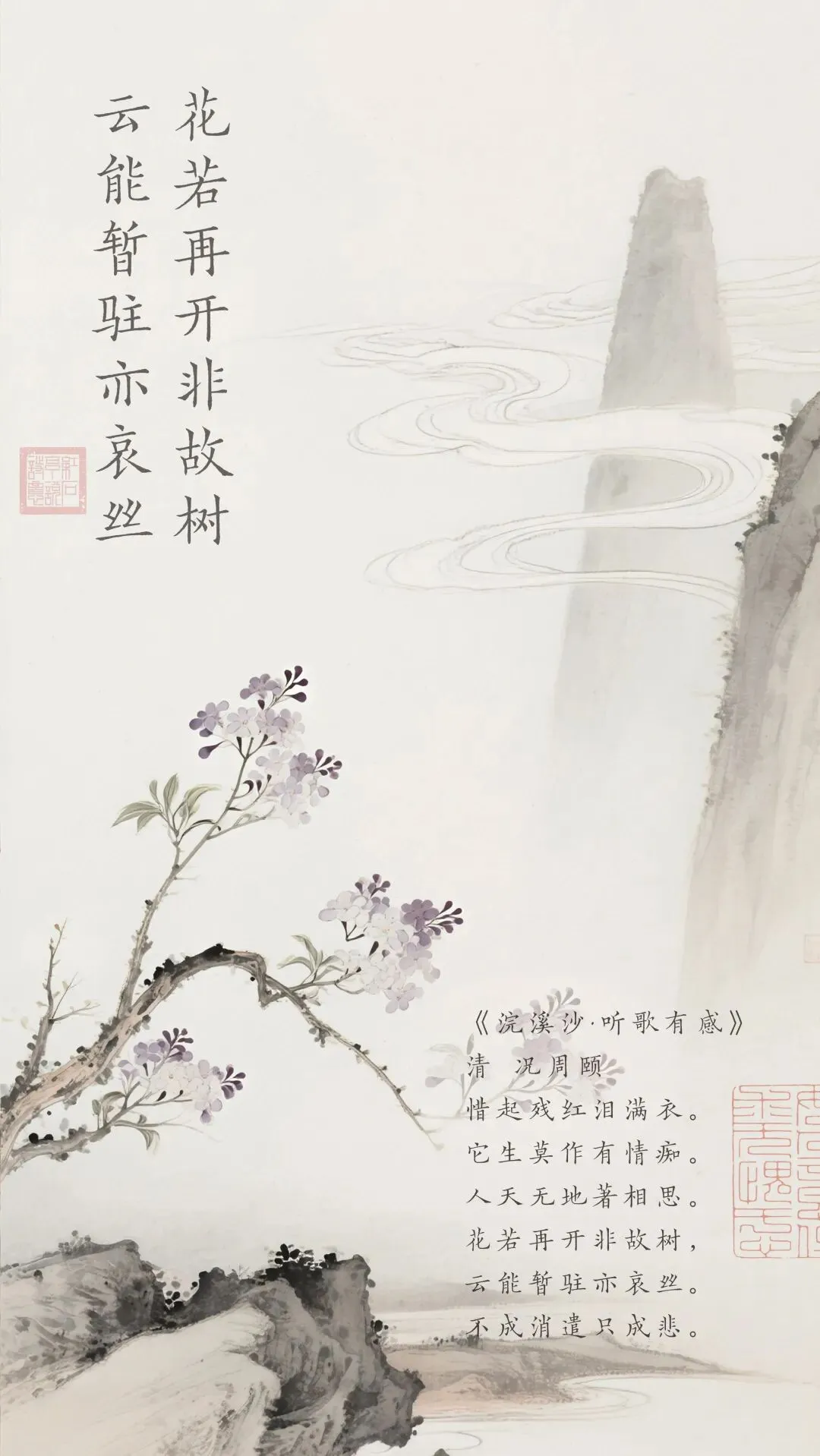 下阕花若再开非故树,云能暂驻亦哀丝” 以两个比喻深化情感:花儿即使再次开放,也不再是原来那棵树上的花;云朵即使能够短暂停留,也如哀婉的琴弦般惹人愁绪。世间的遗憾,莫过于 物是人非,而这份遗憾,恰是 有情痴” 的宿命。结句 不成消遣只成悲” 以直白的感慨收束全词:本想借听歌消遣时光,却没想到反而徒增悲伤。这份 ,不是无病呻吟,而是 有情之人” 的真实心境,完美践行了况周颐 词心” 的主张以真挚的情感打动人心。