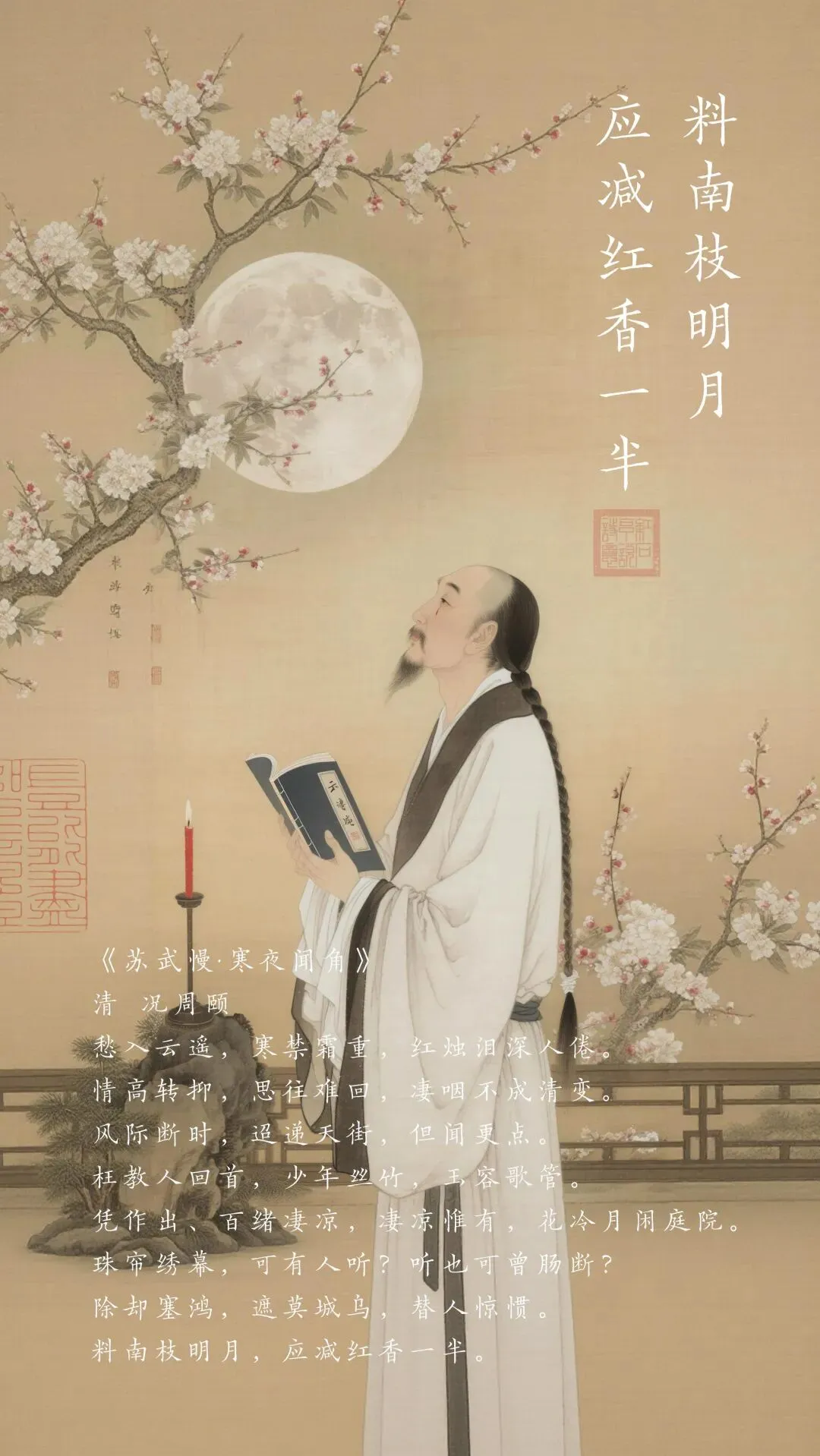结句料南枝明月,应减红香一半” 以景结情,将悲凉推向极致:想必那南枝的梅花,在明月的照耀下,也会减少一半的芬芳。红香减半” 既写梅花的凋零,也暗喻了山河的破碎与文脉的衰落,这份含蓄的感慨,是临桂词派的体现以朴素的意象,写宏大的家国之悲。