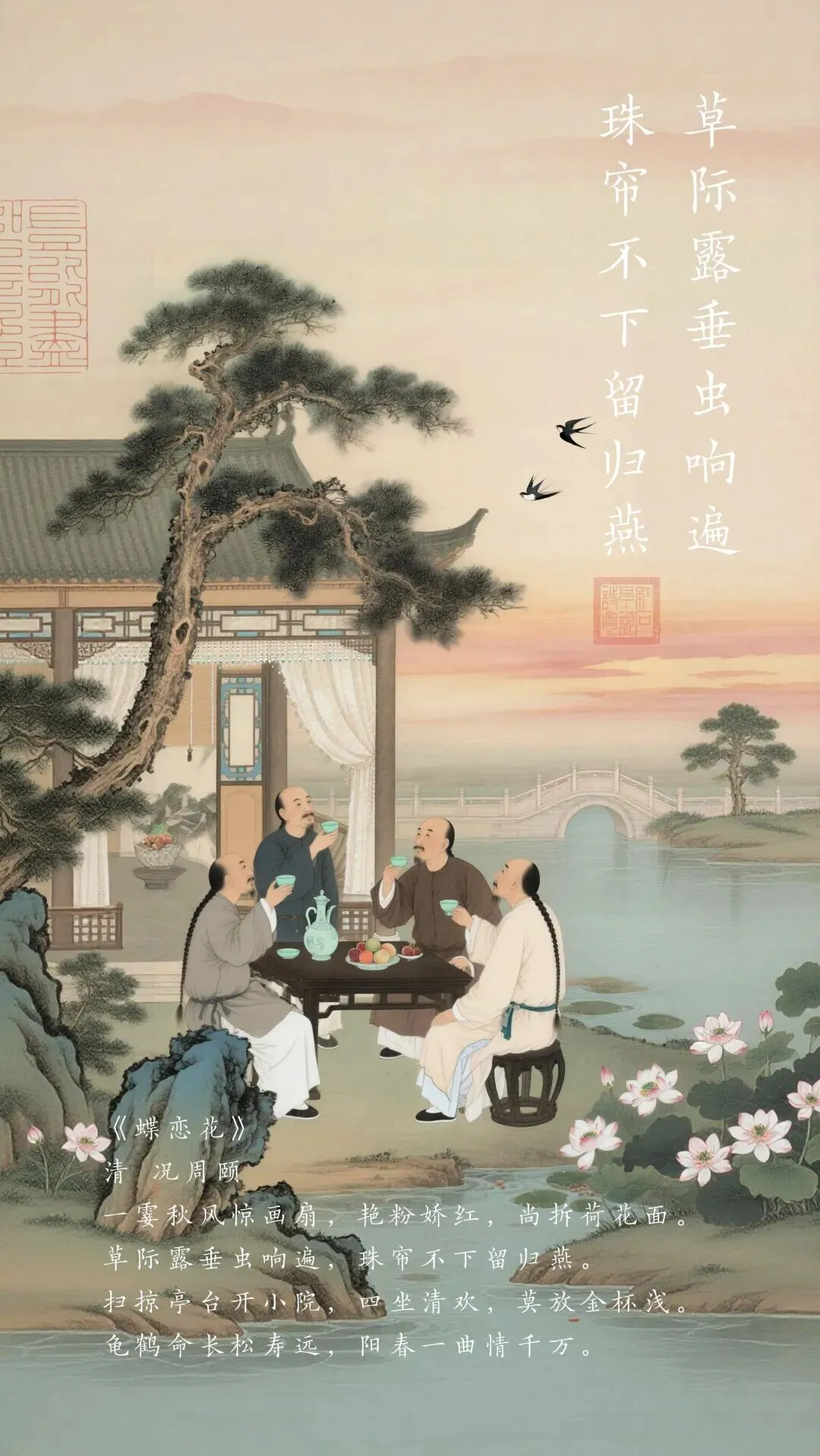 况周颐晚年隐居上海,潜心编撰《蕙风词话》。一个秋日的午后,他在庭院中与友人相聚,见景起兴,写下这首《蝶恋花》。以秋日庭院的清景为意象,抒发了晚年的通透与闲适,是他词境” 理论的实践之作于平凡景物中,寻得深远意境。