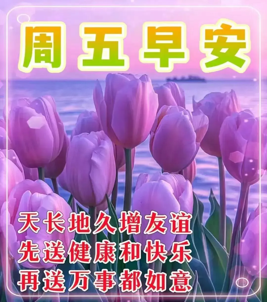 清晨的问候,准时开启;真诚的友谊,不会忘记;永远的朋友,每天想起;深深的祝福,安康第一,周五早安吉祥!