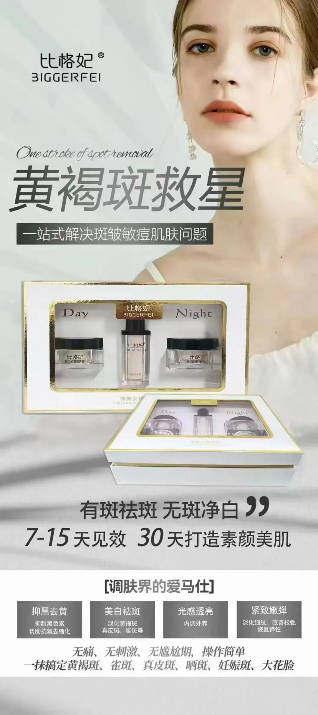 你是否被黄褐斑、真皮斑、雀斑、晒斑、妊娠斑甚至“大花脸”困扰多年?试过很多产品,要么刺激脱皮,要么效果反复,甚至越祛越糟?其实,真正的净颜应该是无痛、无刺激、无尴尬期,居家涂抹就能解决。今天科普的比格妃净颜女神套装,被誉为“调肤界的爱马仕”,有斑祛斑,无斑净白。7-15天见效,30天打造素颜美肌。它采用日夜分护理念,一站式解决斑、皱、敏、痘肌肤问题,让斑点做减法,透亮做加法,肌肤白到会发光。