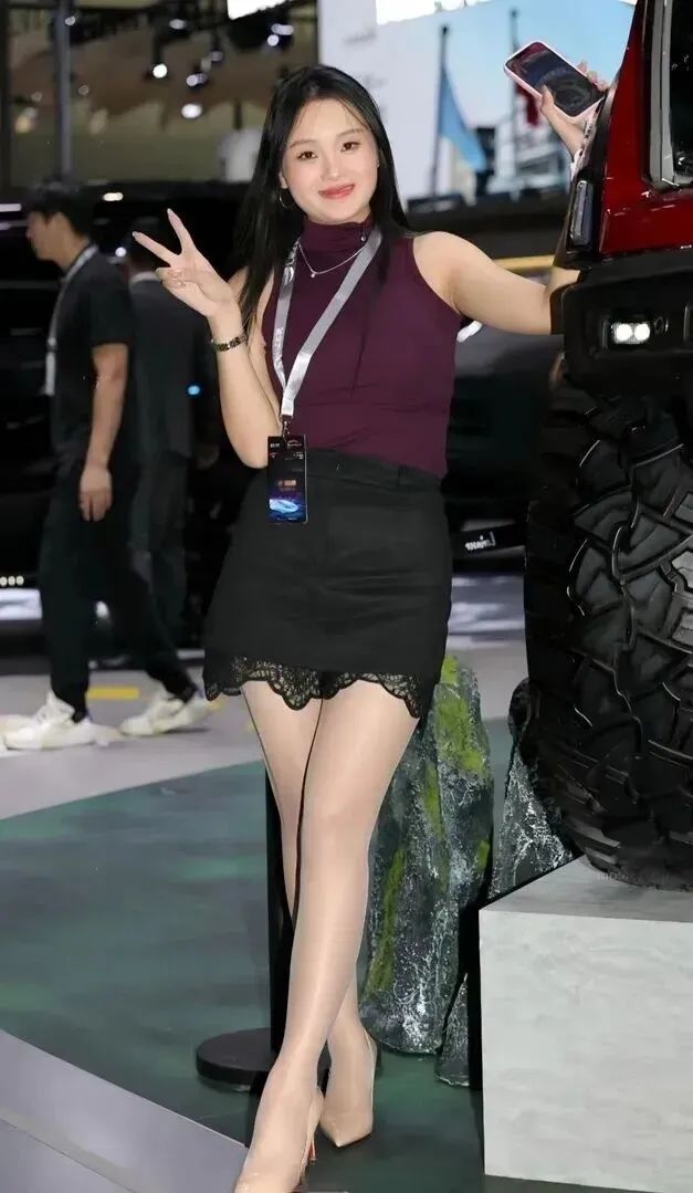 左手轻扶着手机上粉色边框的手机。小小的细节表现出年轻人的可爱。在严肃的车展中这一点俏皮就显得弥足珍贵。她不是来工作的机器,是享受时尚的活生生的人。红色皮卡和她在一起,刚柔并济,画面有故事感。