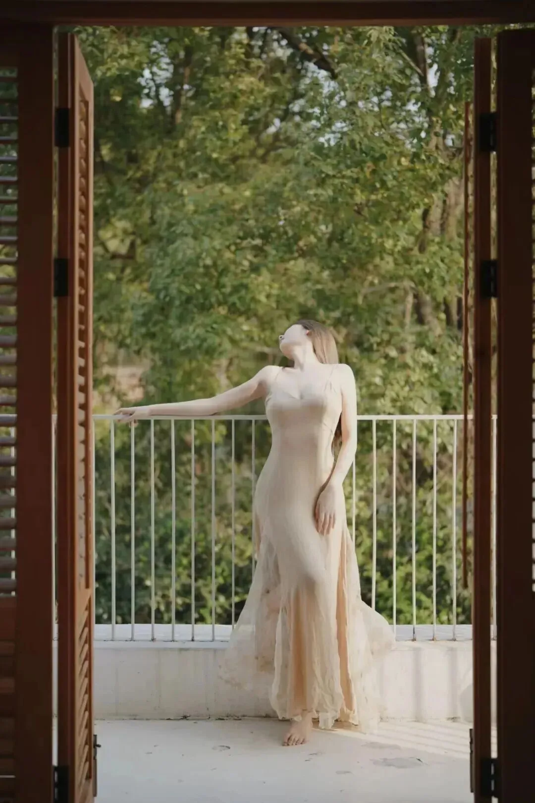 第三个动作,适合有阳台的场景。站在栏杆旁,背对或侧对镜头,手轻轻扶着栏杆,头微微仰起看向远处的绿植。这个动作能很好地展示背部线条和裙子的整体剪裁,显瘦又显高,给人一种向往自由的延伸感。仿佛下一秒就要走进自然里,画面非常有生命力。