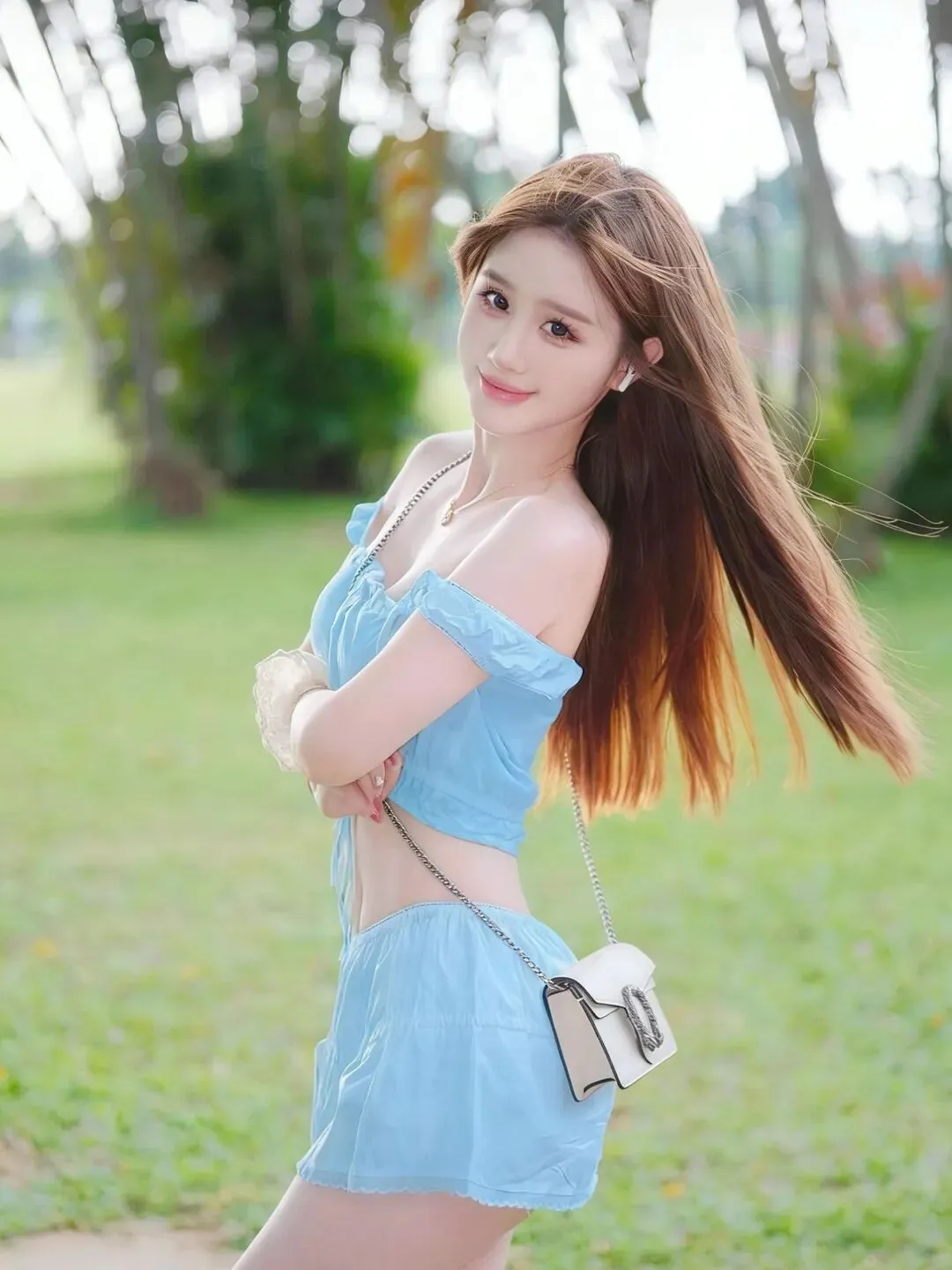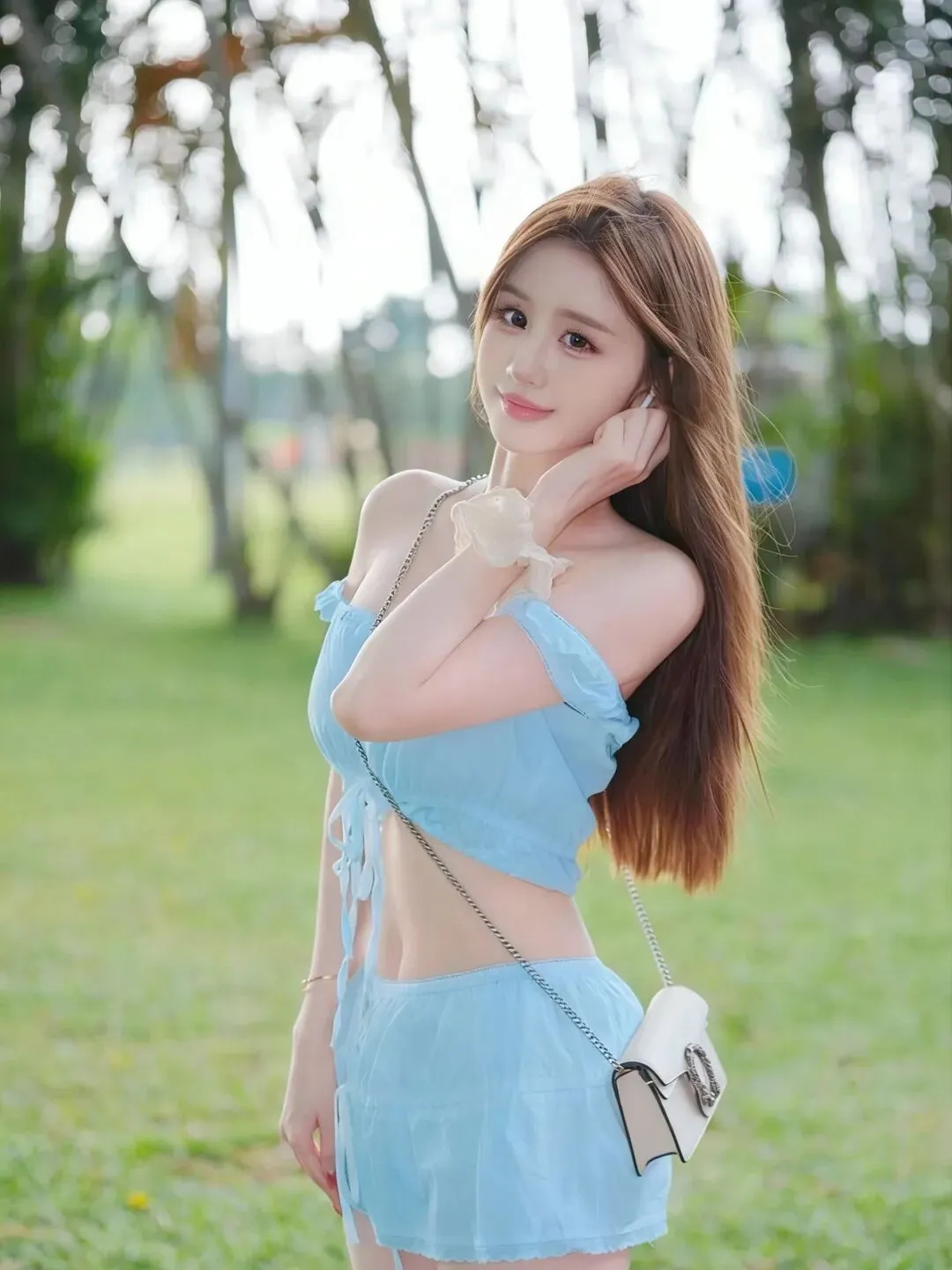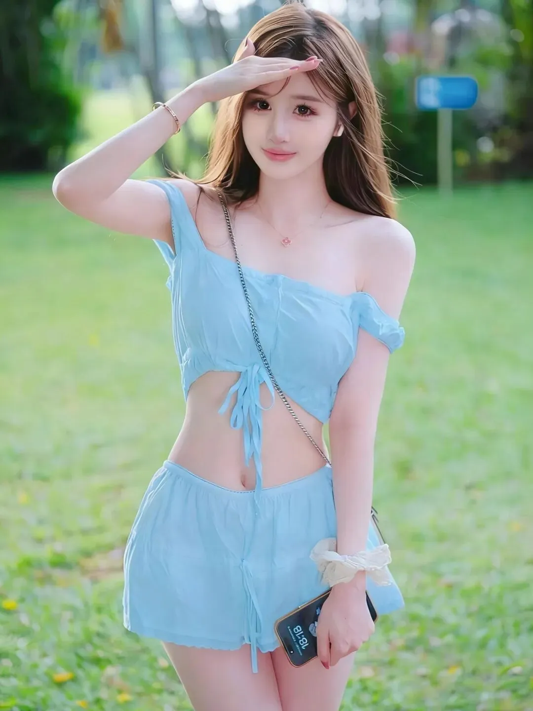📷风里已经有夏天的味道啦🌿 一身清透的冰蓝套装,露腰设计勾勒出纤细腰线,一字肩藏着恰到好处的温柔。在绿意盎然的草坪上,抬手接住满溢的阳光,把松弛与清甜穿在身上,定格属于少女的夏日元气与浪漫。