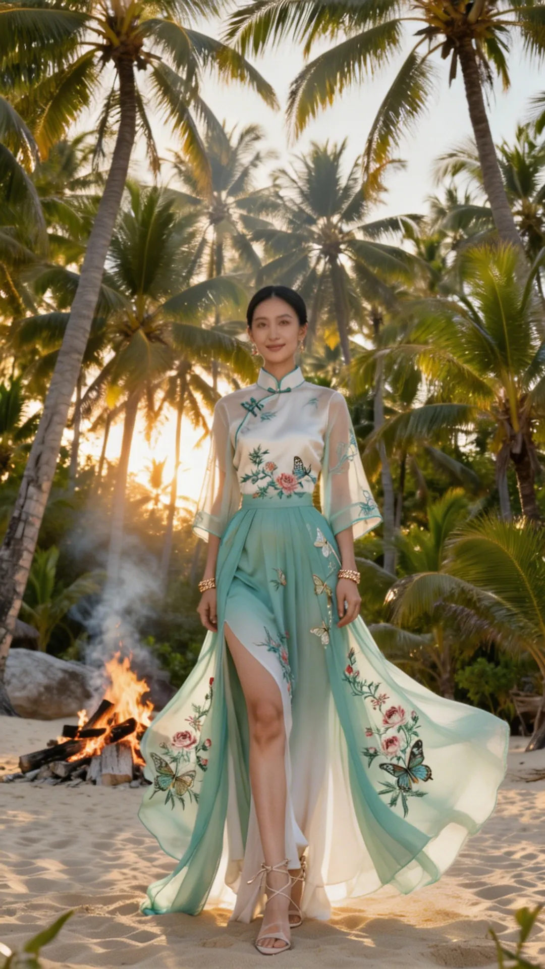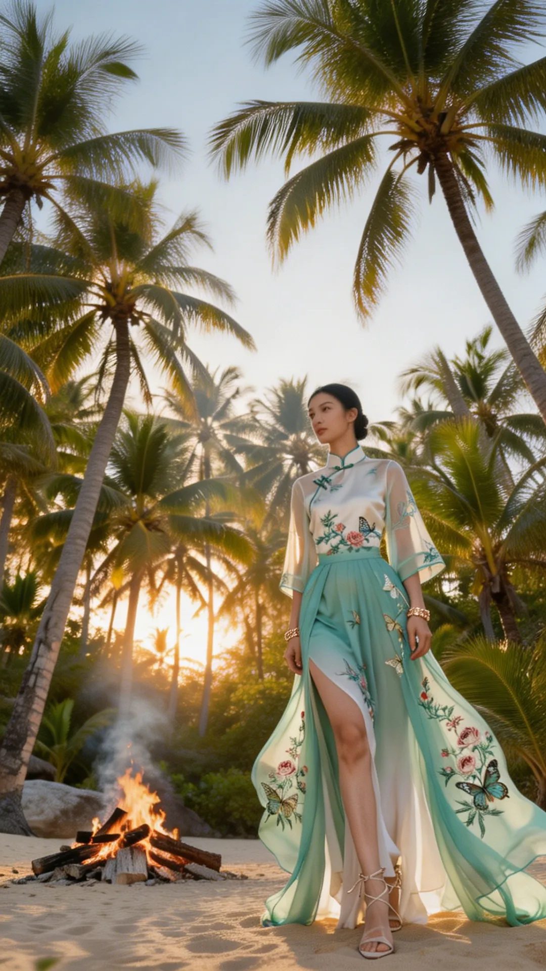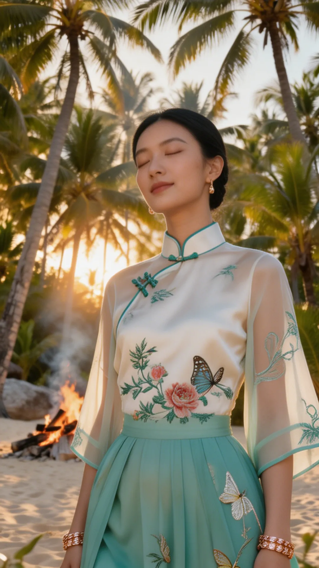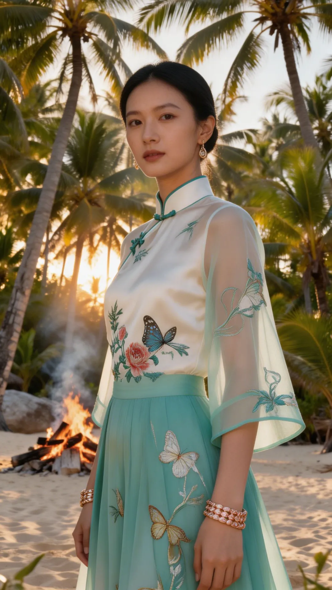 这套 look 的精髓,在于一个 “融” 字。 不是把中式的衣服硬穿去海边,也不是把热带的元素硬加在中式上,而是让它们在气质上相互成就: 热带的风,吹散了中式的厚重;东方的韵,中和了热带的随意。