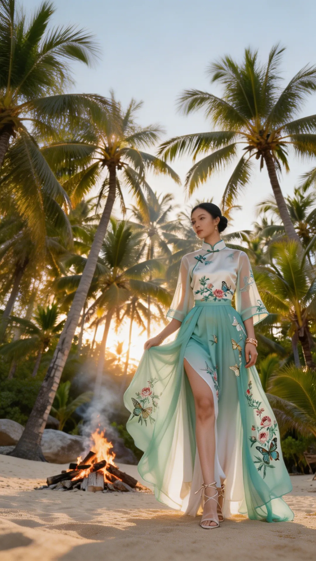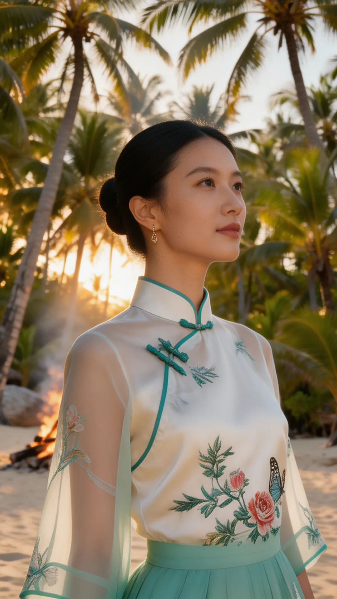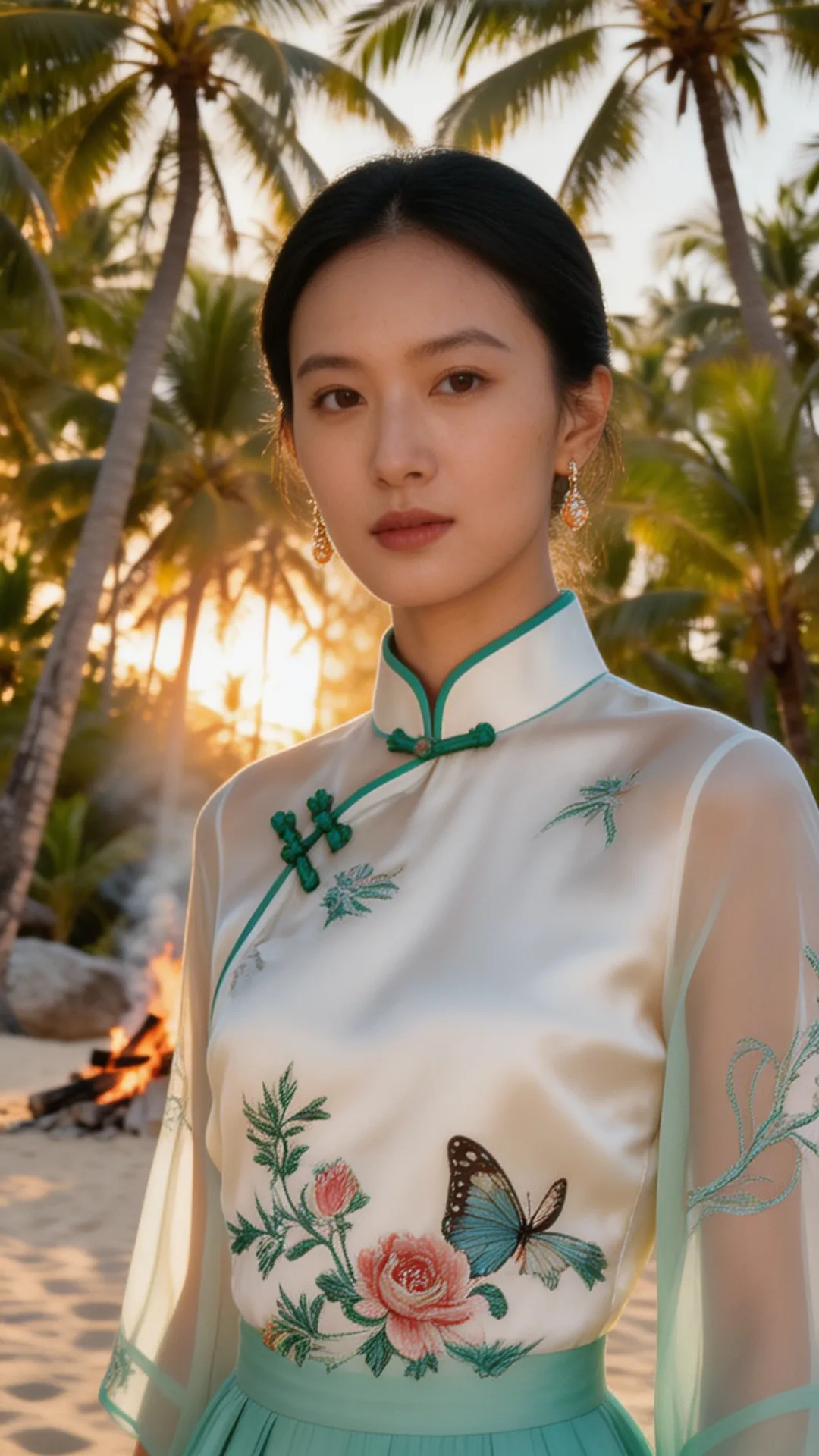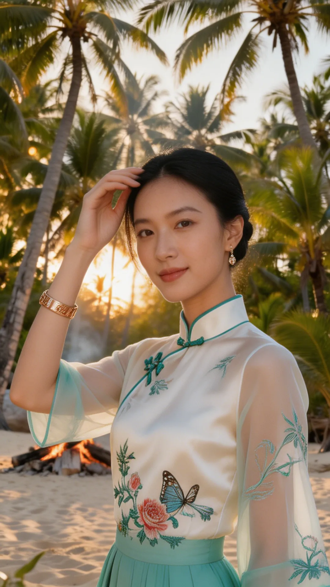 这套 look 的精髓,在于一个 “融” 字。 不是把中式的衣服硬穿去海边,也不是把热带的元素硬加在中式上,而是让它们在气质上相互成就: 热带的风,吹散了中式的厚重;东方的韵,中和了热带的随意。