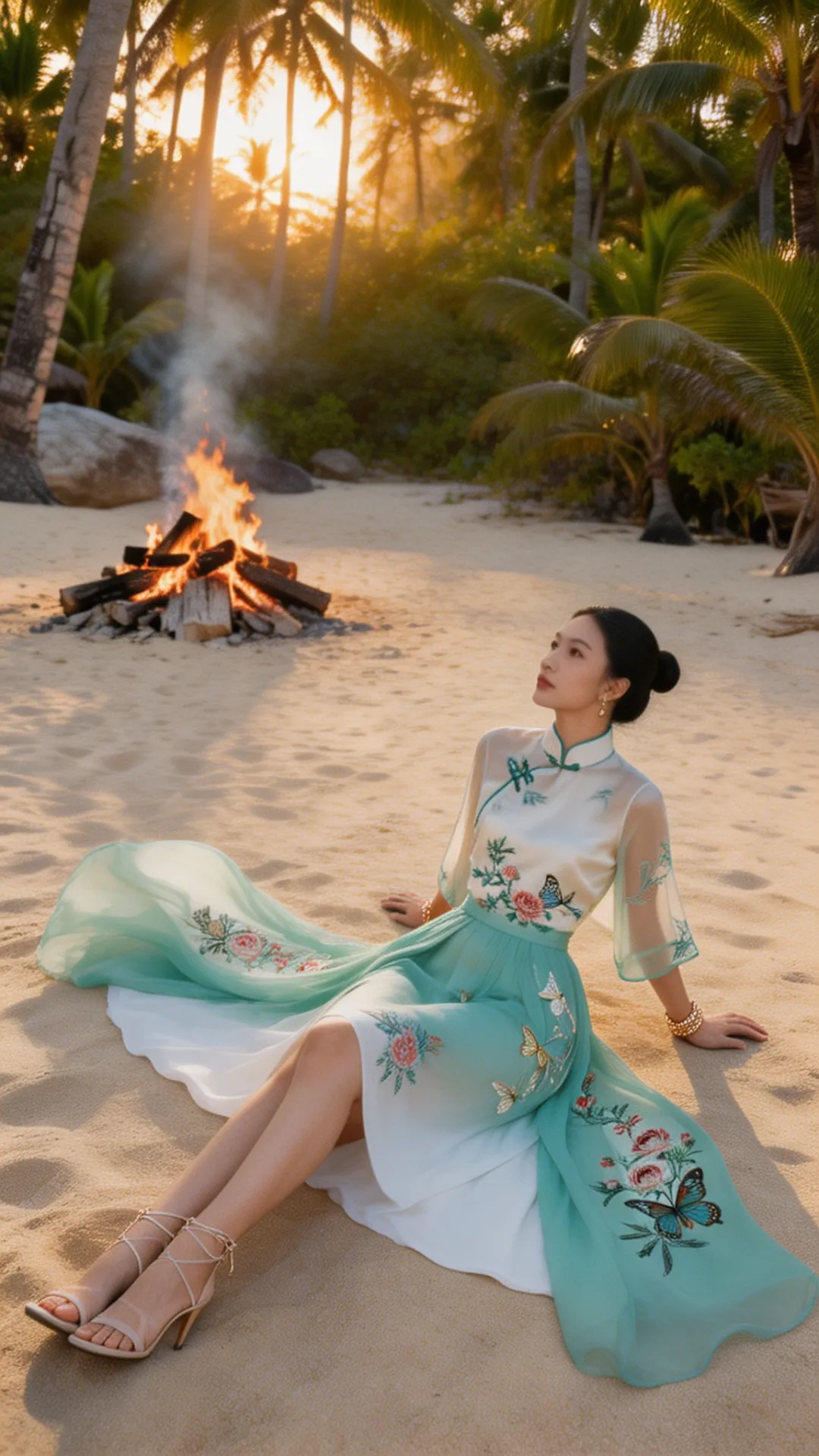 这套 look 我选了青碧 + 月白 + 象牙白的渐变色系: 象牙白的刺绣旗袍上衣,带着东方的精致;青白色渐变的长裙,像把海水的颜色穿在了身上;还有那件浅 sage green 的半透明外搭,风一吹就轻轻飘起来,轻盈得像云。