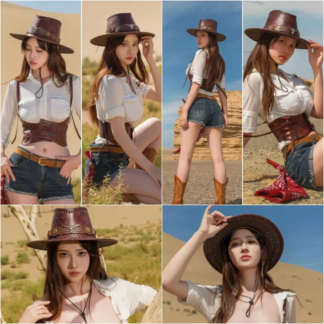 牛仔短裤、丝巾、束腰和皮帽,