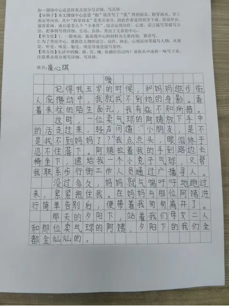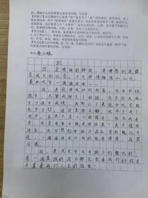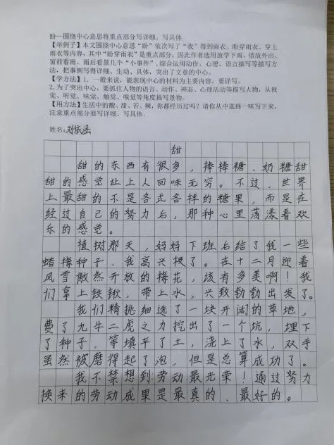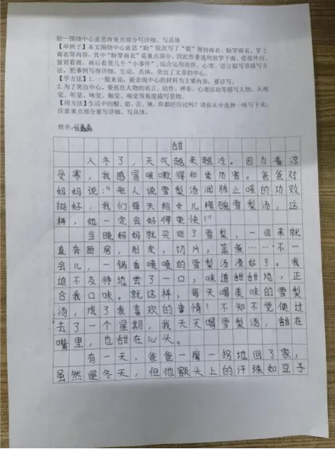 完成写作后,语文教师针对“中心是否明确、重点是否详写、细节是否生动”三个维度进行点评。