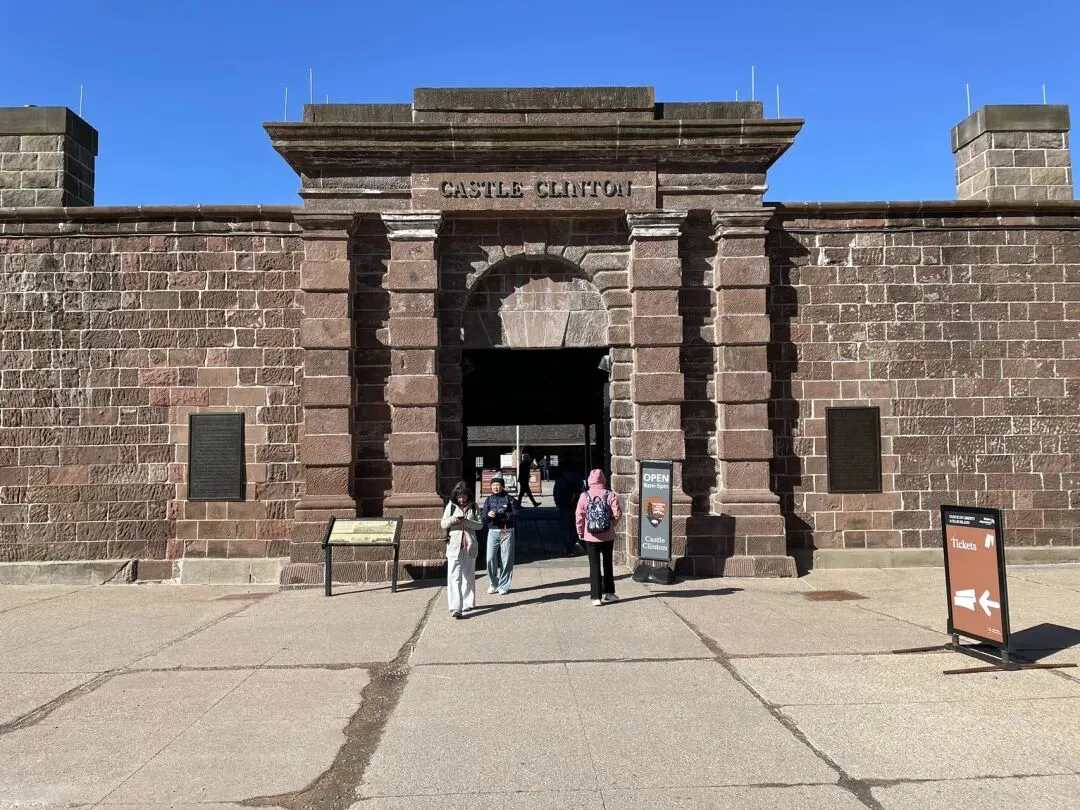在巴特里公园Battery Park搭乘渡轮前往自由女神像,售票/取票在柯林顿古堡,不用担心找不到,公园内到处都有指引。