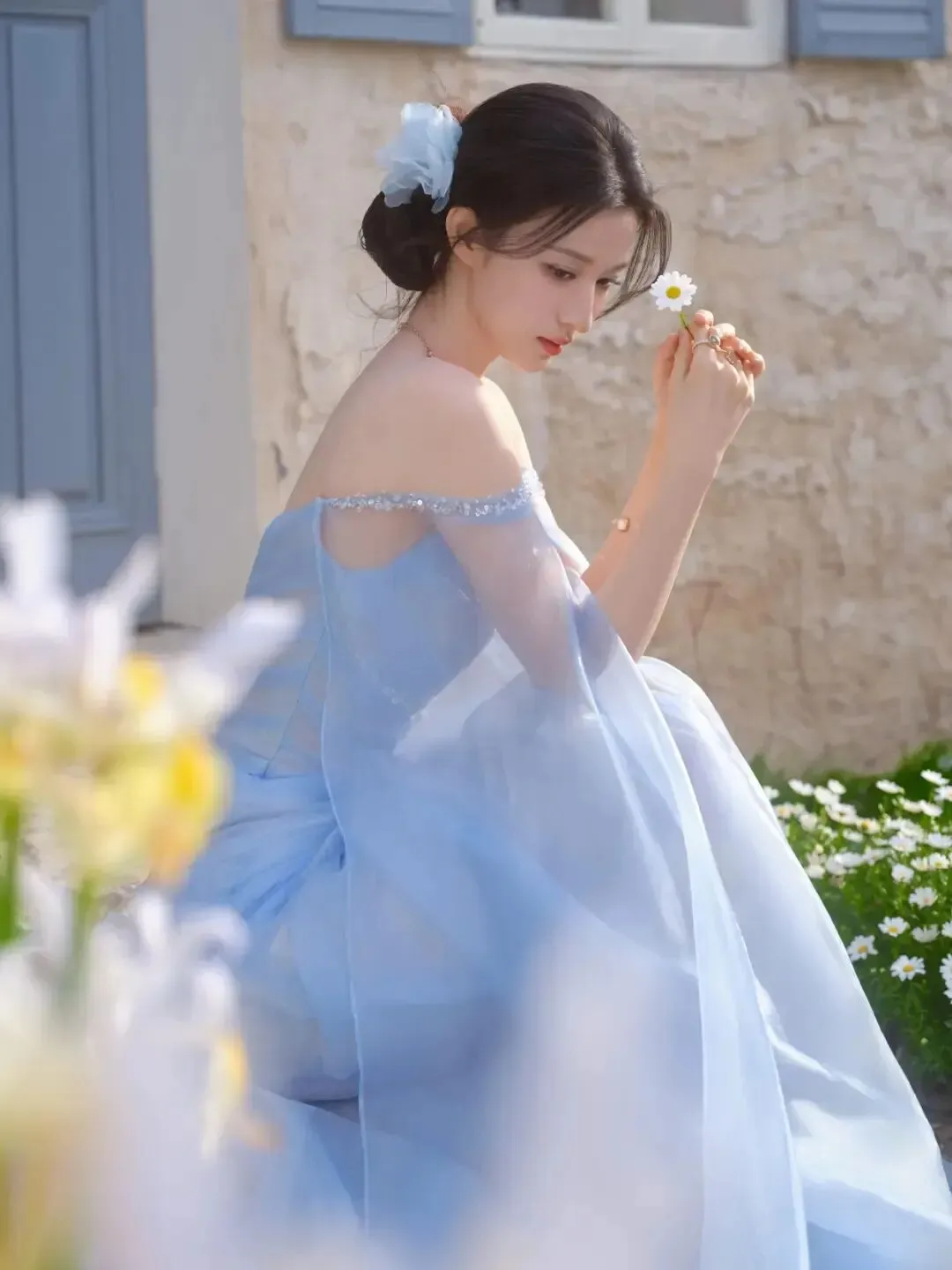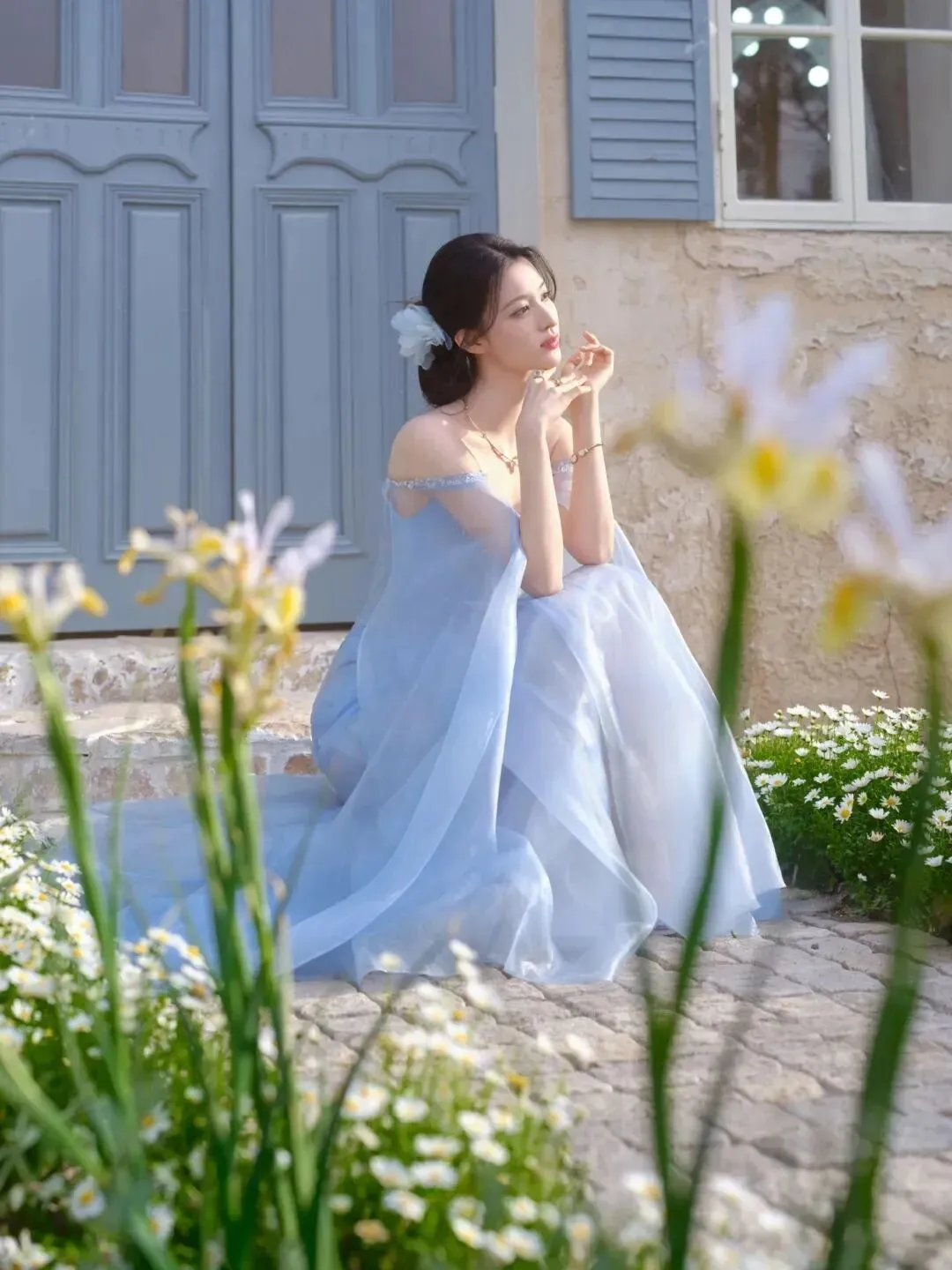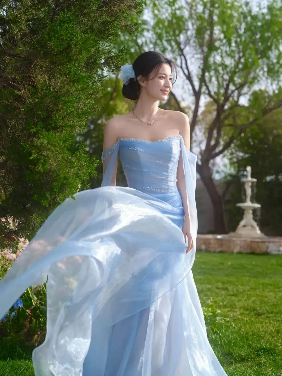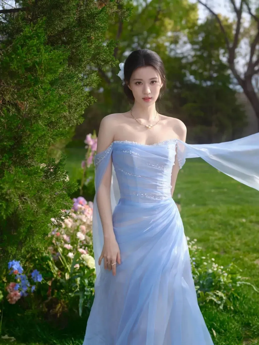 先说说这条裙子。冰蓝色,你说它是蓝吧,里头又透着点儿青;你说它是青吧,光线一照又泛出淡淡的银白。纱裙很薄,一层叠着一层,风一吹,裙摆就飘飘悠悠地荡起来,像湖面上漾开的水纹,又像清晨第一缕还没散尽的雾气。