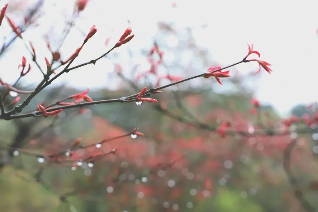 微雨后,山林中一片静谧,凝结的雨露像珍珠般小心翼翼地挂在红枫上。道路尽头传来她们的细语和欢笑,也为这山间春色增添了几分生机。