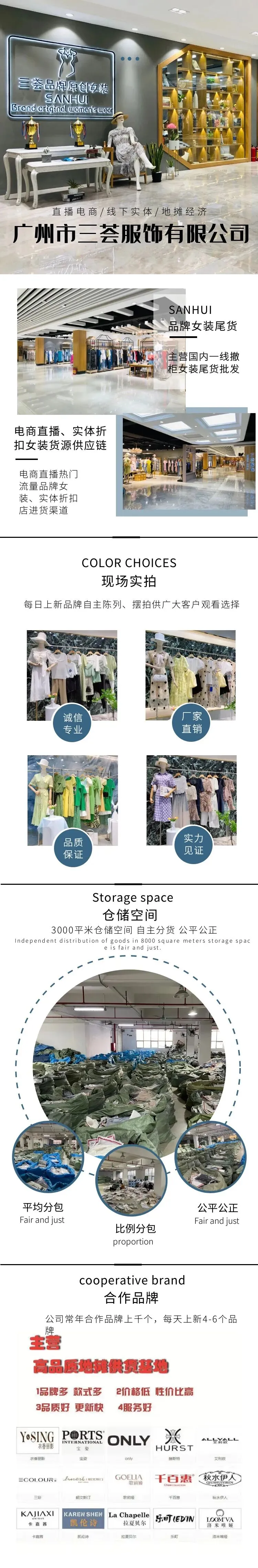 广州市三荟服饰有限公司位于中国尾货女装品牌基地广州白云区石井镇。是专业经营国内外品牌女装折扣批发的流通企业。公司2015年正式成立,拥有2000多平米展厅,3000多平米仓库,将同步推出适应季节兼具趋势的品牌女装尾货,对每季推广上市数千个款式进行陈列,为客户提供更丰富的商品。主营专业:电商直播热门品牌女装、品牌折扣店、商场特卖场的货源批发,正品专柜品牌女装货源走份打包批发