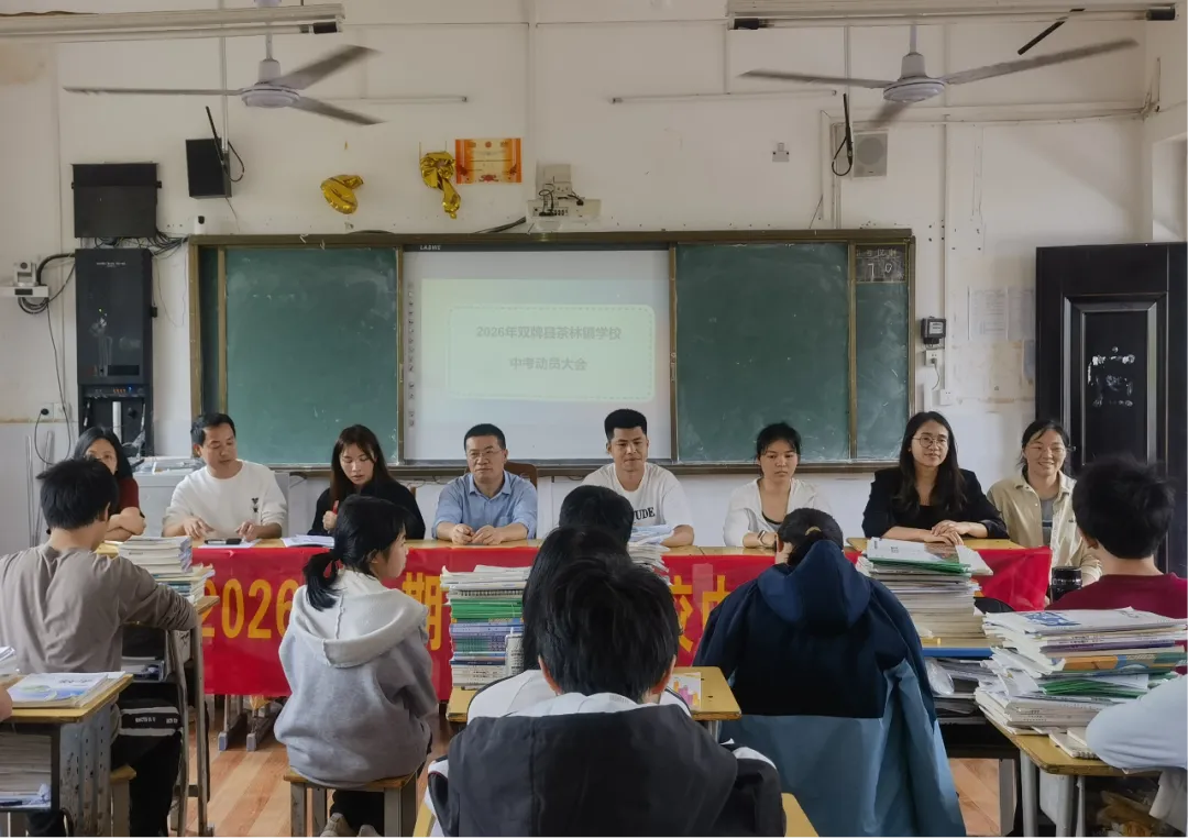 4月9日上午,茶林镇学校举行2026届九年级中考部署会,学校领导、全体师生及家长代表参加。大会在国歌声中启幕,校长作动员讲话,教师、家长、学生代表依次发言鼓劲。全体九年级学生集体宣誓表决心,会后师生共同在横幅上签名,展现全力冲刺中考、决胜六月的坚定信念。邓武林 雷城建